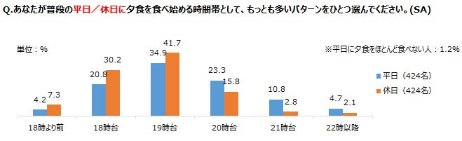 夕食の開始時間のピークは19時台平日より休日のほうが早く、平日は開始時間のバラつきが大きい