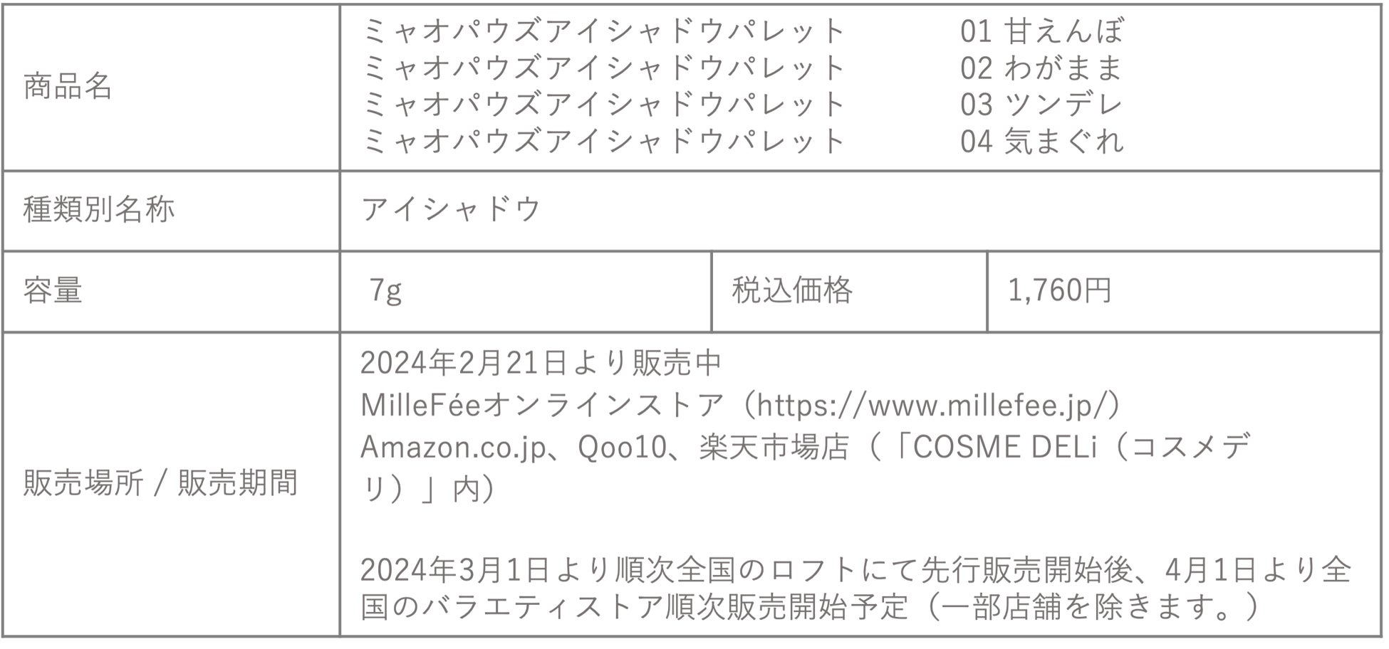 ミルフィー株式会社(所在地:東京都中央区、URL: https://www.millefee.jp/ )は、猫の肉球がモチーフとなった「ミャオパウズアイシャドウパレット」を全4色で展開いたします。