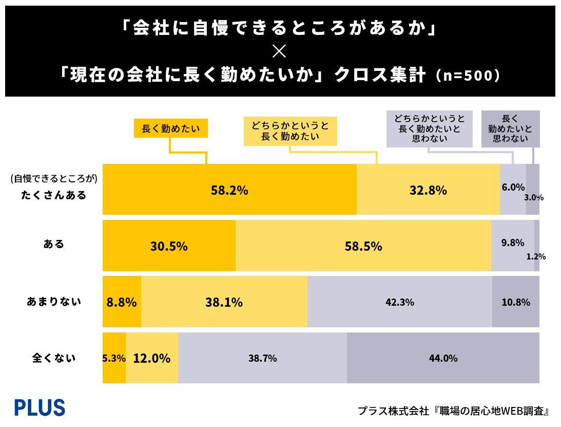 自慢できるところが「たくさんある」グループでは91%が「今の会社に長く勤めたい」と答えたのに対し、自慢できるところが「全くない」グループでは17.3%。