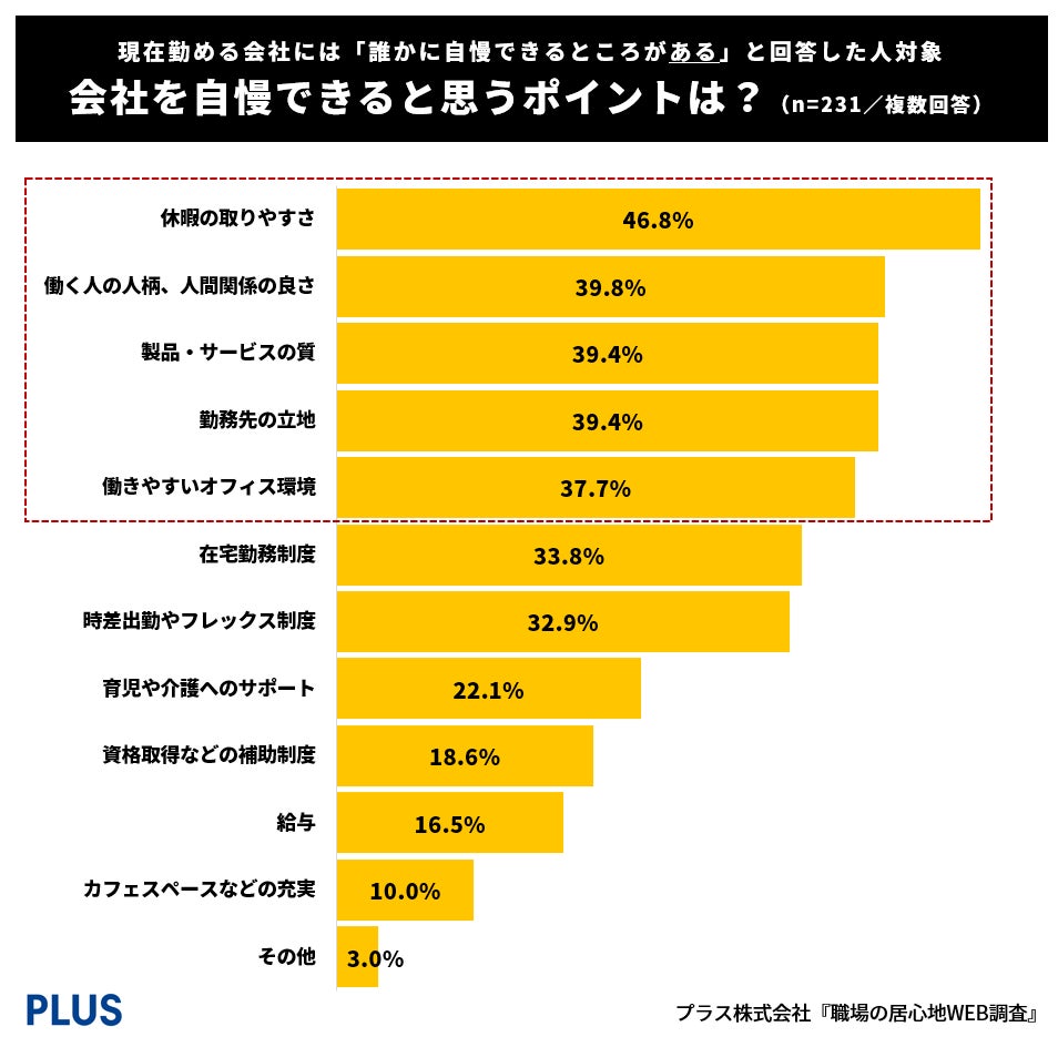 次に、自慢できるところが「ある」「たくさんある」と回答した231名に対し『自慢できるポイント』を複数回答で尋ねたところ、「休暇の取りやすさ」「働く人の人柄、人間関係」「製品・サービスの質」「勤務先の立地」「働きやすいオフィス環境」が上位5項目となりました。