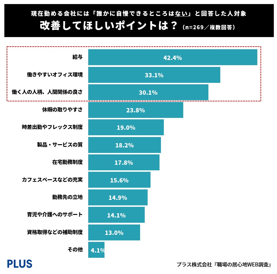 次に、自慢できるところが「あまりない」「全くない」と回答した269名に対し『改善してほしいポイント』を複数回答で尋ねたところ、「給与」「働きやすいオフィス環境」「働く人の人柄、人間関係の良さ」が上位3項目となりました。