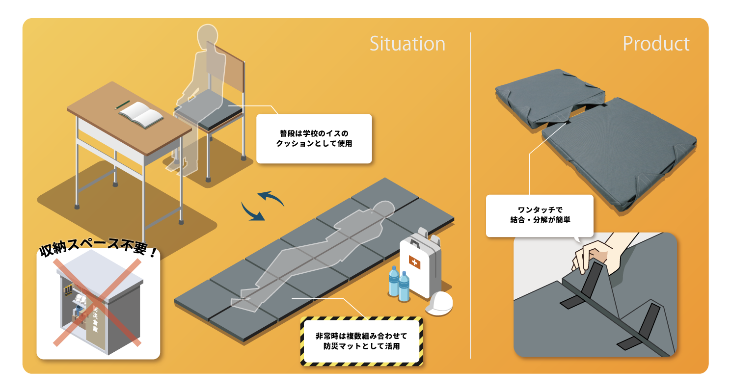 この製品は、普段は小中学校の教室で生徒の皆さんの椅子のクッションとして使用し、災害時には避難場所で