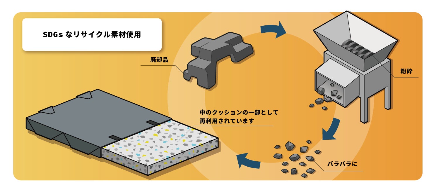 この防災用マットは、当社の生産過程で出るウレタン端材を粉砕してチップモールドにし、カバーをかぶせて