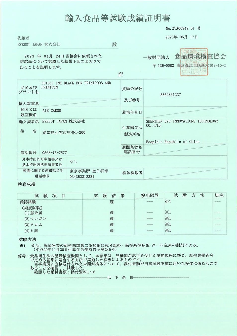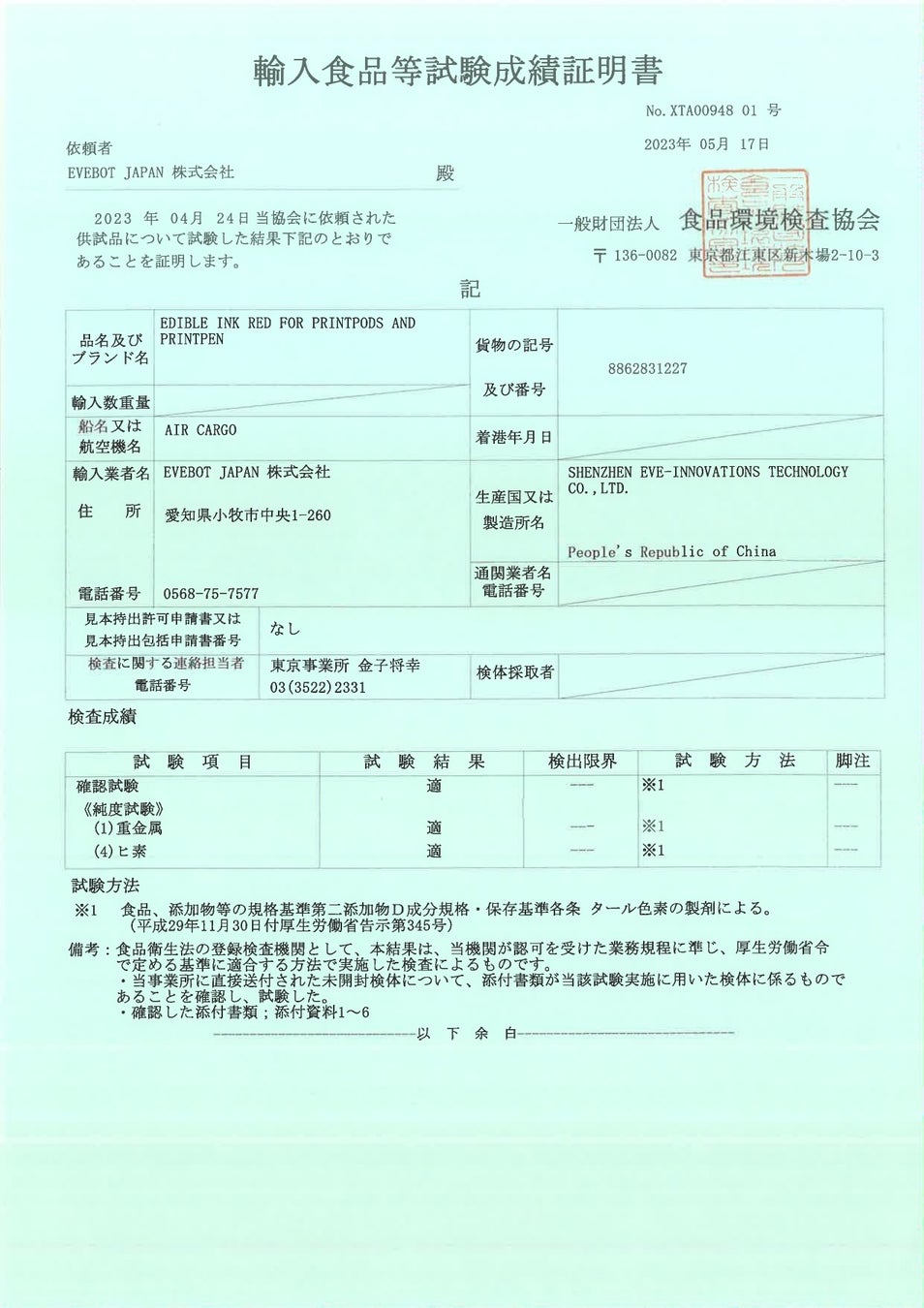 この食用インクカートリッジは、厚生労働省の指定する日本の登録検査機関の検査に合格し、厚生労働省 東京検疫所 食品監視課より食品等輸入届出済証が発行された製品です。これまでEVEBOT社が販売していた食用インクはアメリカやヨーロッパ等のFDA(食品医薬品安全庁)で承認を受けたものでした。国内で販売するにあたり、安全性を確保するため、約1年半前から開発に着手し、ようやく販売にたどり着くことができました。インクの色は茶色に加え、このたび赤、黒のラインナップが揃いました。熱転写方式によりあらゆる食品に印刷することができ、オリジナルで開発した専用の定規(別売)を使うことで、正確に食品へ印刷ができます。