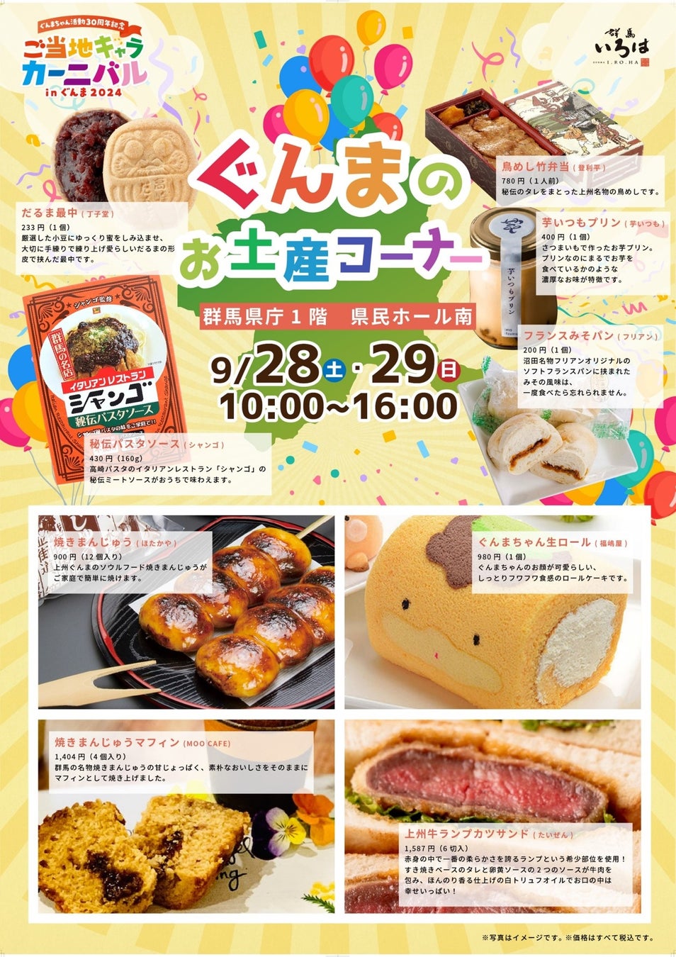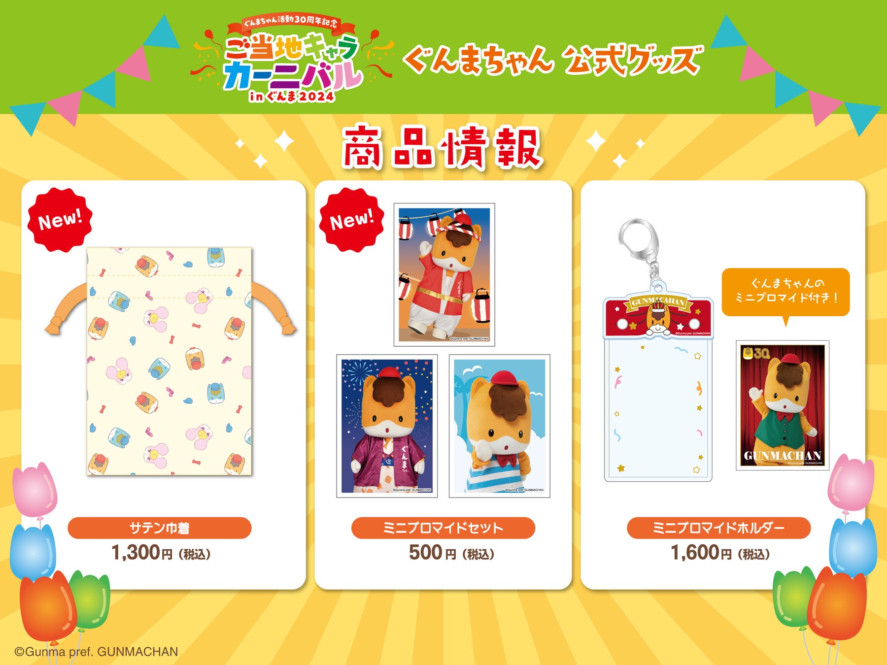 県民広場のぐんまちゃんブースや、県民ホール(南)の物販エリア「ぐんまのお土産コーナー」でぐんまちゃん公式グッズを販売します。今回のご当地キャラカーニバルで新発売となる商品も用意しています。会場でのお買い物もぜひお楽しみください。