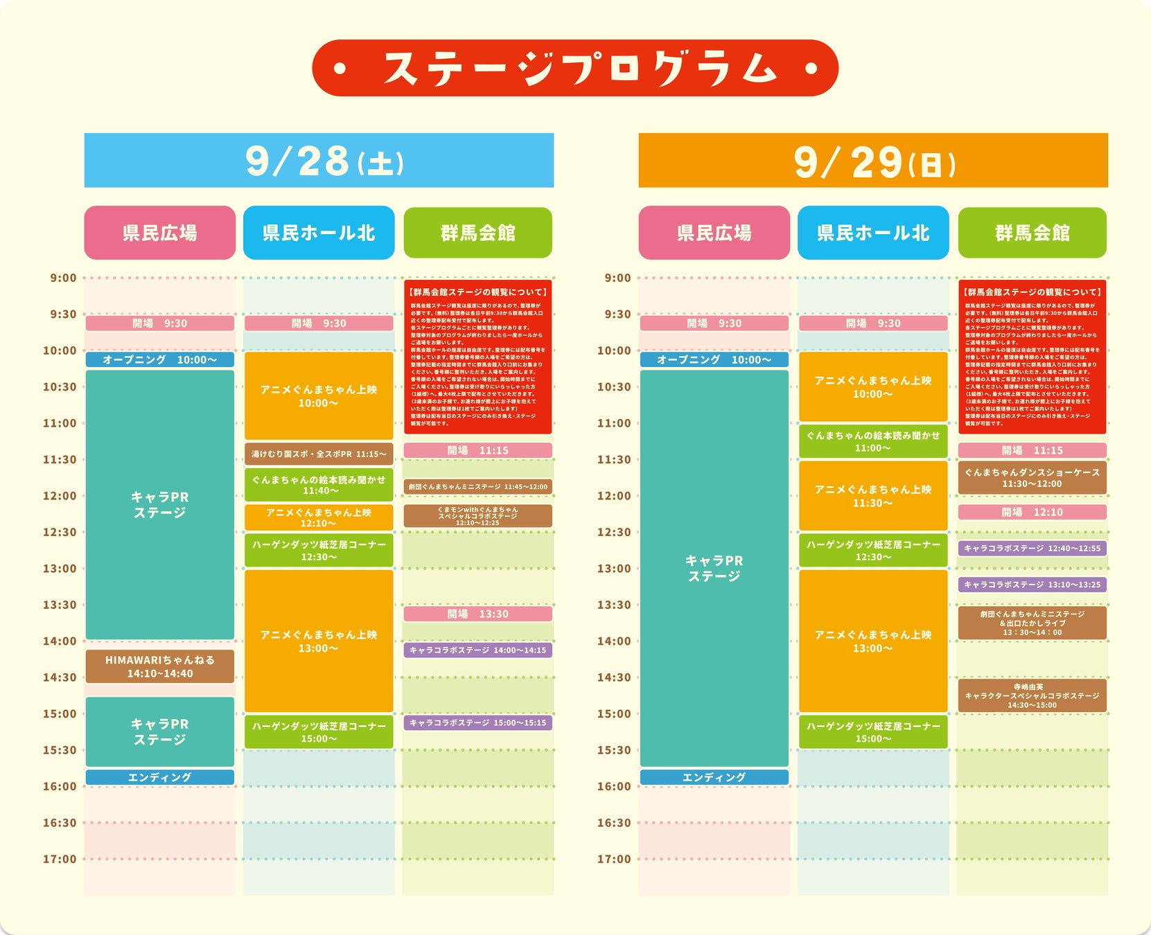 今週、9月28日(土)、29日(日)に開催予定のぐんまちゃんの活動30周年記念「ご当地キャラカーニバル in ぐんま2024」のタイムテーブル(ステージプログラム)を発表します。今年は県民広場、県民ホール(北)、群馬会館の3つのステージをご用意いたしました。各ステージでのプログラムをお楽しみください。