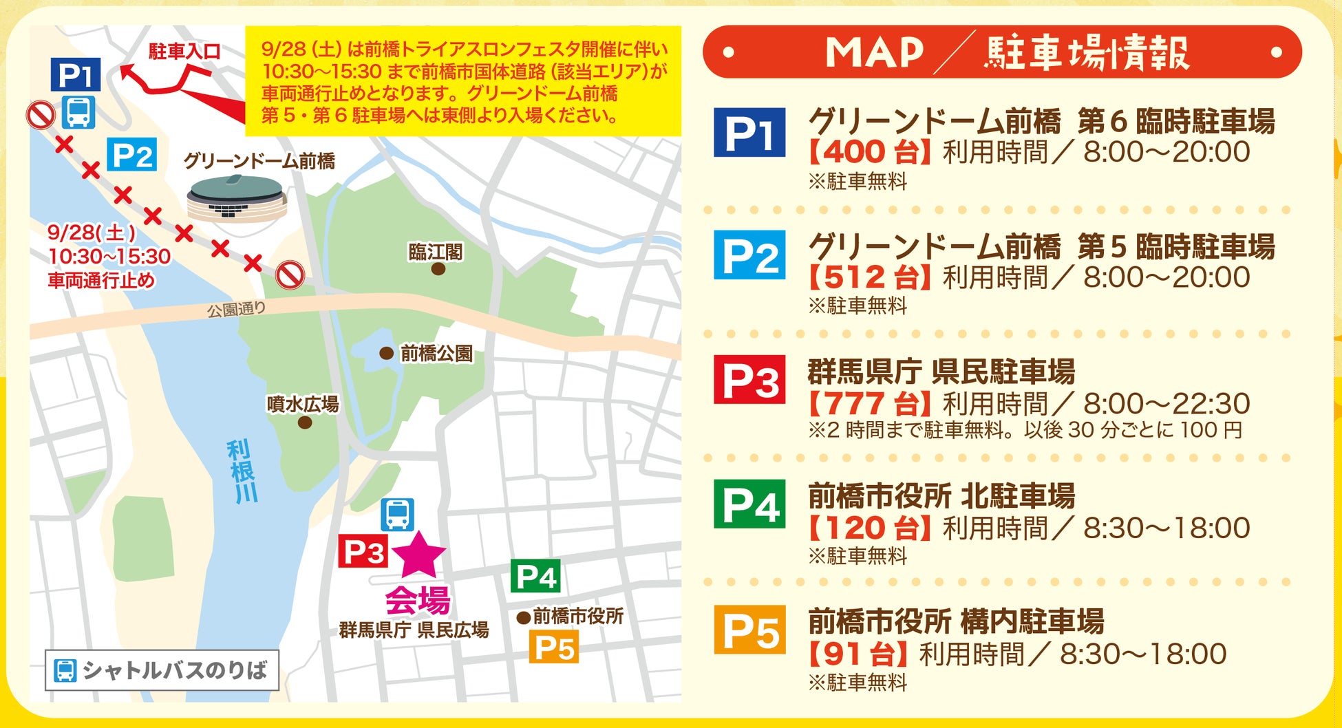 イベント当日は下記MAPのとおり、近隣の駐車場をご利用いただくことができます。駐車台数に限りがありますのと、混雑も予想されますので、公共交通をご利用いただくことをおすすめいたします。9月28日(土)は、「前橋トライアスロンフェスタ2024」が開催されることに伴い、前橋市国体道路に交通規制が入ります。お車で来場される方にはご迷惑をおかけしますがご理解ご協力のほどよろしくお願いします。