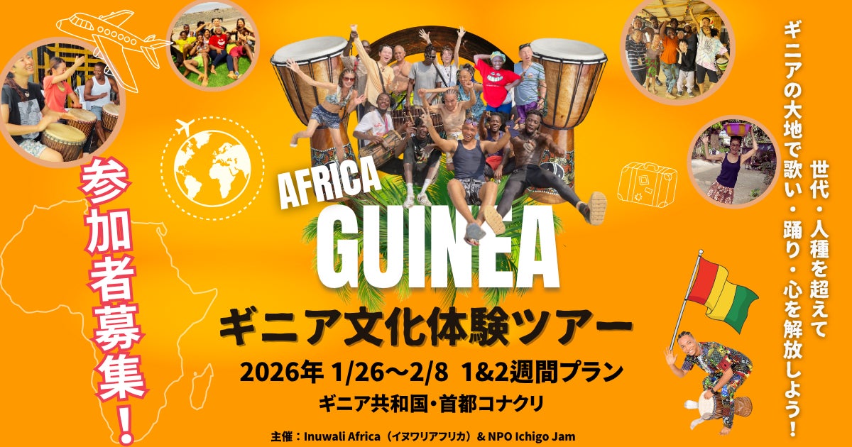 NPO法人一期JAM(日本)、同法人がギニアに設立した政府認定NGO「Ichigo Jam Guinée」、およびギニア現地法人イヌワリアフリカ(Inuwali Africa Guinée Conakry SARLU・ギニア共和国コナクリ)は、西アフリカ・ギニア共和国にて「文化体験×観光×社会貢献」を一度に体験できる少人数スタディツアーを、2026年1月26日(月)〜2月8日(日)に共同で開催いたします。