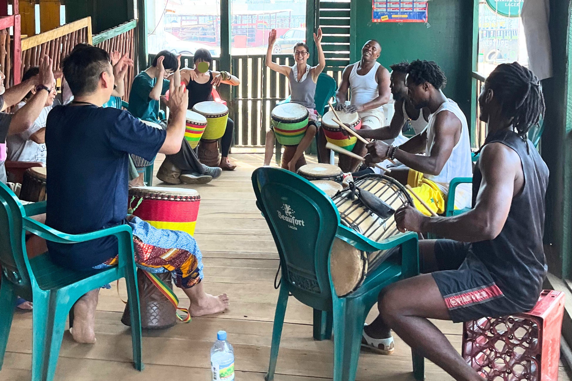 ギニア国立舞踊団ジョリバ(Ballet National Djoliba)など現地の一流アーティストを中心とした現地のミュージシャン、そして参加者が同じ輪になり、ジャンベやアフリカンダンスを一緒に叩き・踊り・過ごします。「見学するお客さん」ではなく、「一緒にその場にいる仲間」として迎えられる時間を大切にしています。初心者から経験者まで、それぞれのペースで参加できます。