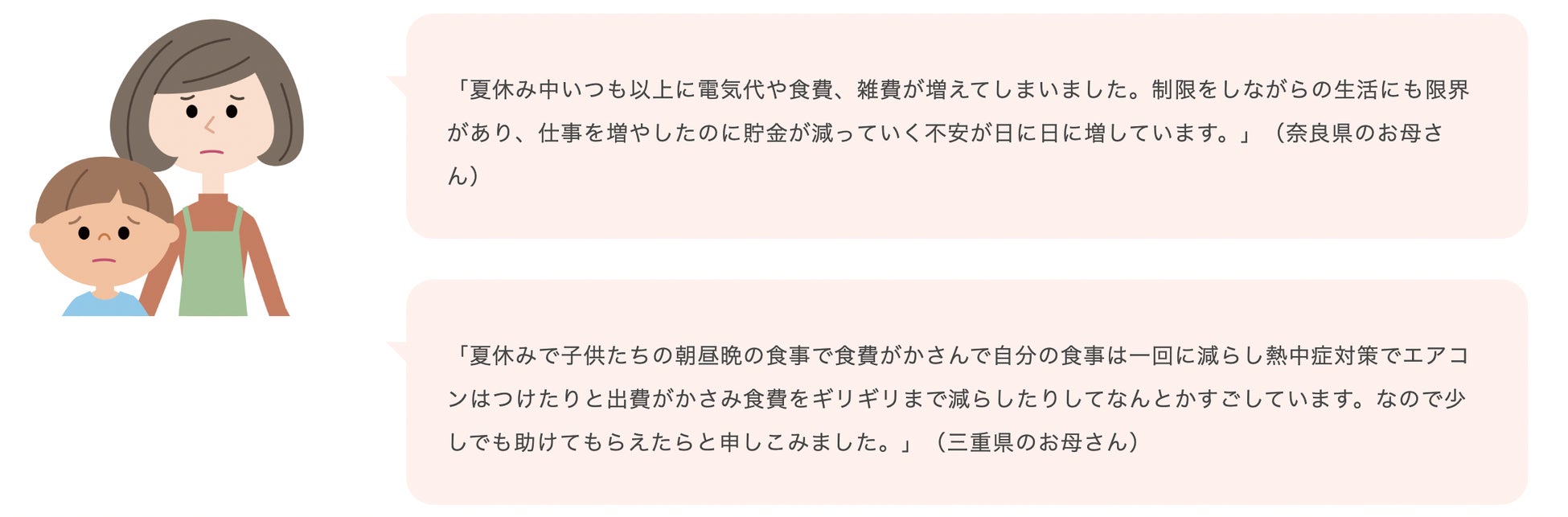 夏休みなどの長期休暇は、給食がなく食費や光熱水費もかさむため、家計が圧迫されやすい時期です。長期休暇の時期には「たすけて」の声がいっそう増える傾向にあります。夏休みのシーズンに私たちのもとに寄せられた声の一部をご紹介します。