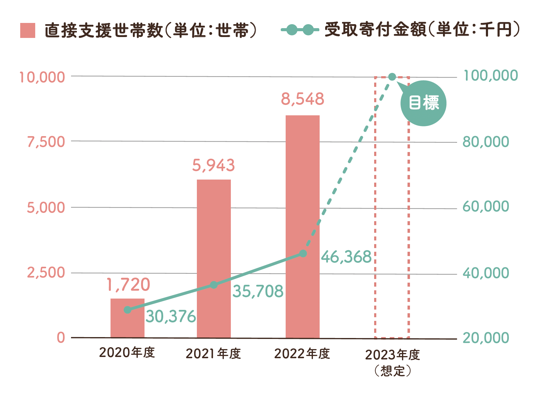 配送費は皆さまからのご寄付を活用させていただいています。コロナ前と比べて寄付は約2.2倍に増えましたが、それを上回る規模の支援要請があり、バランスを保つことが困難になっています。