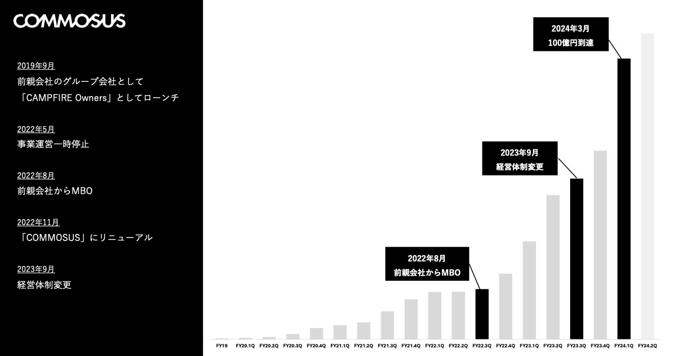 2019年9月のサービス開始から約4年半で100億円超となりましたが、そのうち2023年9月の経営体制変更以降で50億円超となり、約半年間の間に2倍にサービスは成長しました。これは2022年9月のMBOを経て、2023年9月に資本政策・経営陣・執行体制を大幅に刷新したことに起因しています。尚、2023年通期のファンド発行額は45.6億円でしたが、2024年は1-4月で既に40億円を超えています。2024年は年間100億円のファンド発行額を目標に掲げており、足元、順調に推移しています。