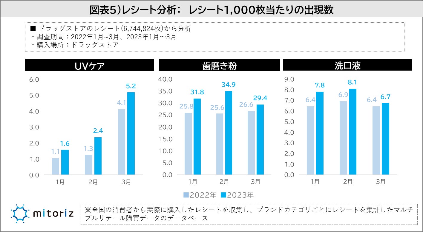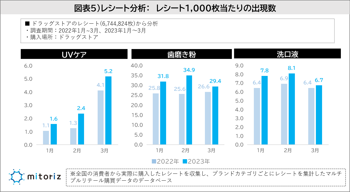 POB会員が実際に購入し、投稿したレシートからマスク緩和に伴い需要増加が見込まれる「UVケア」、「歯磨き粉」、「洗口液」について、レシート1,000枚当たりの出現数で分析します(図表5)。