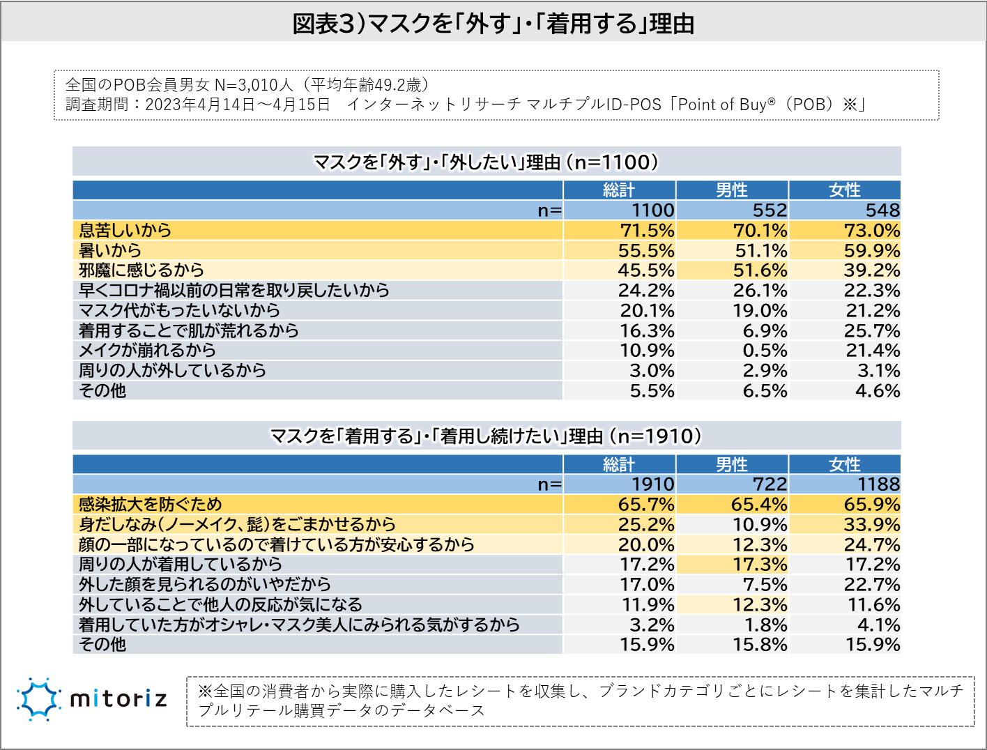 女性は「身だしなみ(ノーメイク、髭)をごまかせるから(33.9%)」、「顔の一部になっているので着けている方が安心するから(24.7%)」の比率が高く、特に「身だしなみ(ノーメイク、髭)をごまかせるから(23.0%)」、「顔の一部になっているので着けている方が安心するから(12.3%)」、「外した顔を見られるのがいやだから(15.2%)」が男性より10P以上も高い結果となりました(図表3)。
