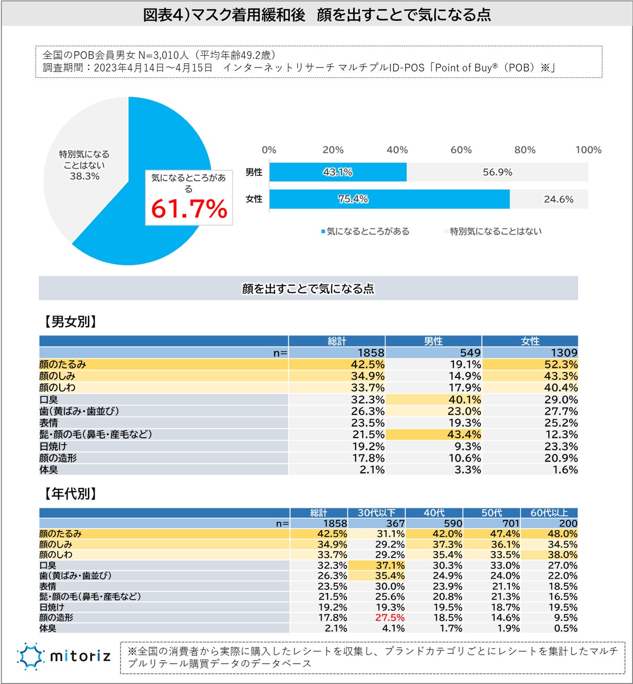 60%以上がマスクを外して顔を出す上で気になる点あり、男性「髭や鼻毛」女性「顔のたるみ」が上位