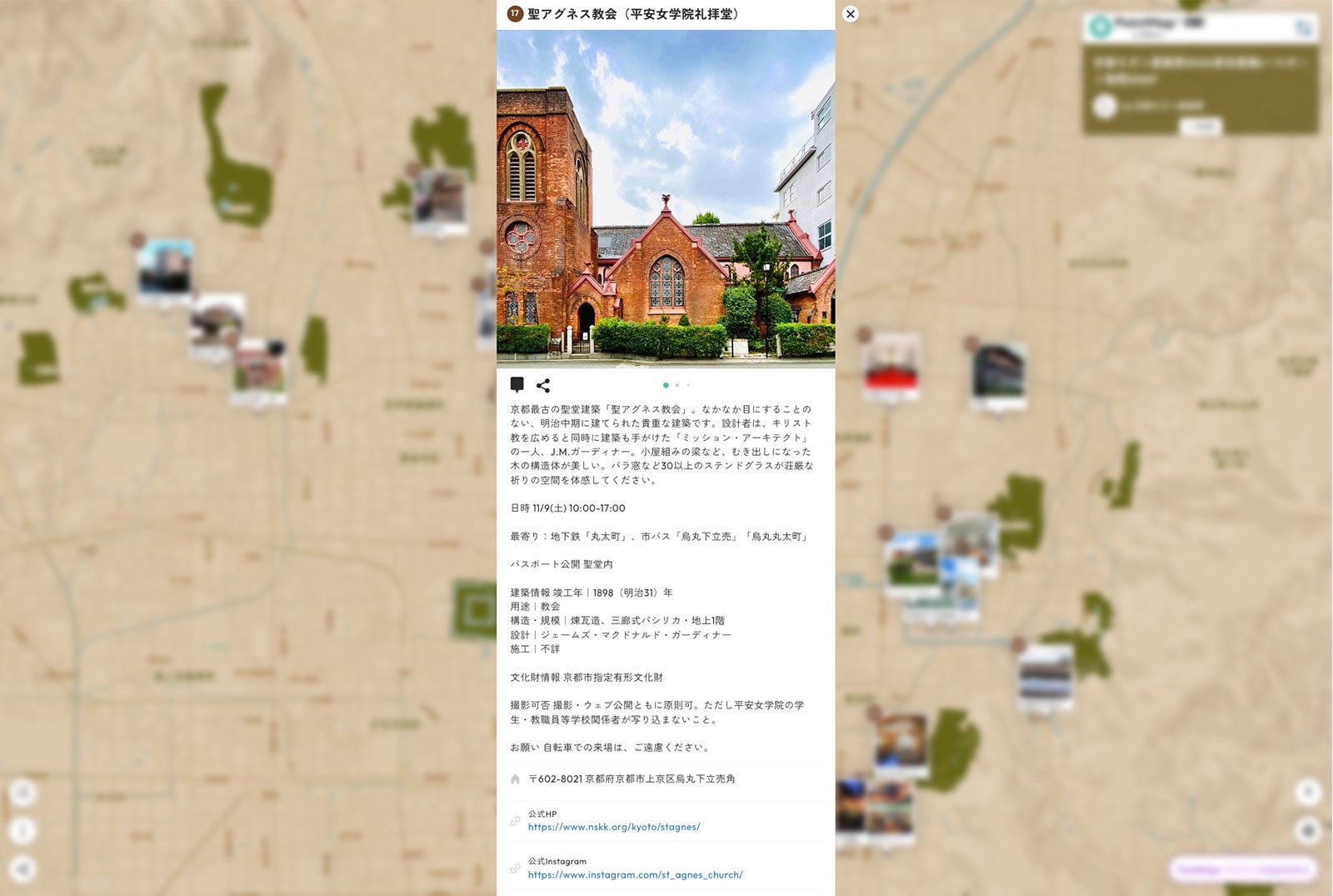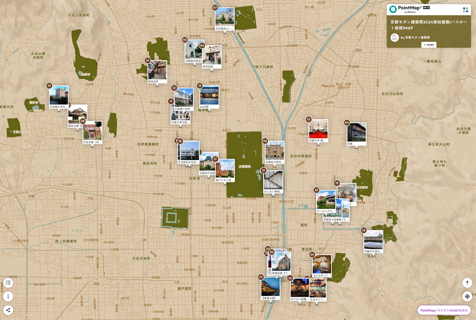 京都モダン建築祭の、「パスポート公開」に登録された建築物をまとめた公式デジタルMAP(前期と後期2種)を共同制作しました。