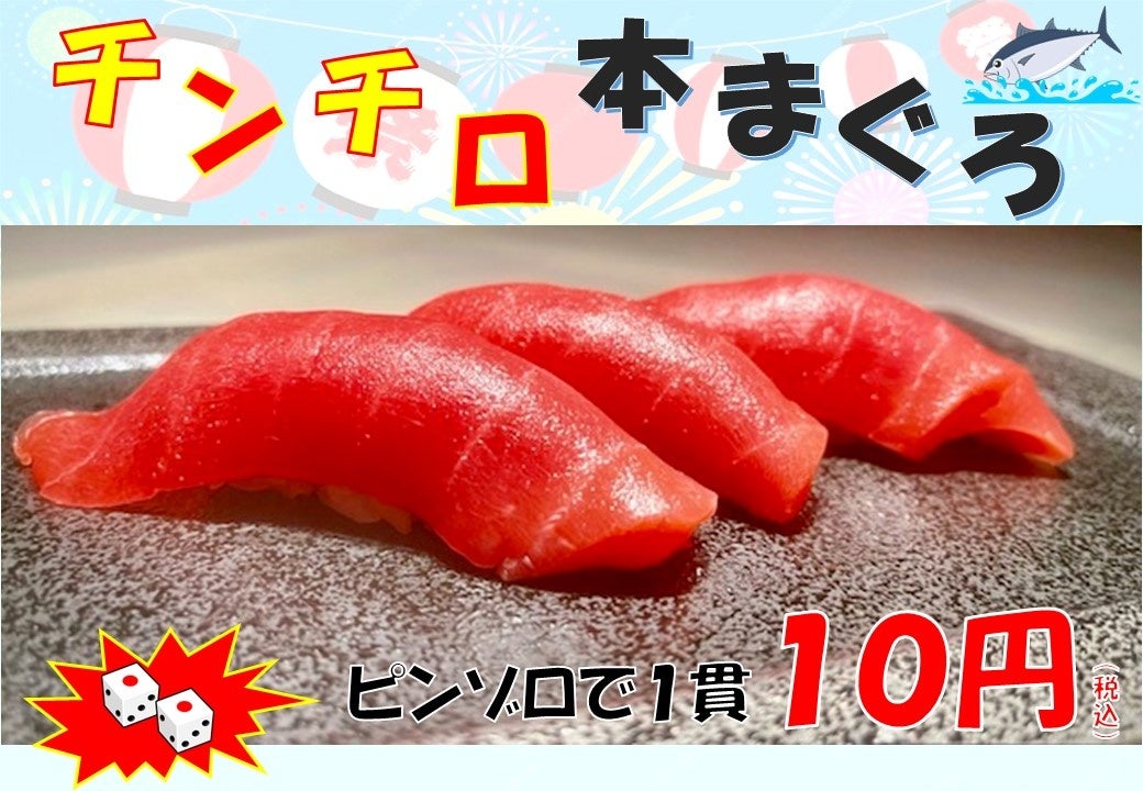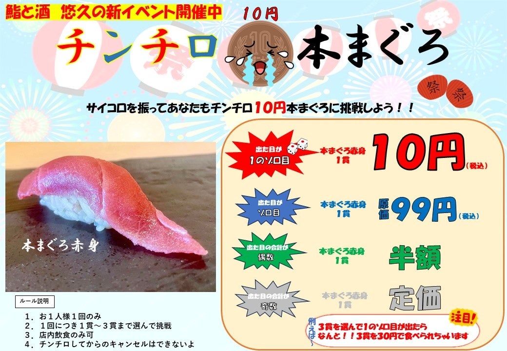 【チンチロ本まぐろ】に挑戦。鮨と酒 悠久の新イベント。最大10円、1/2で半額以上、悪くても定価(220円)で本まぐろが食べられるお客様に損のない他にはない最高のイベント開催中