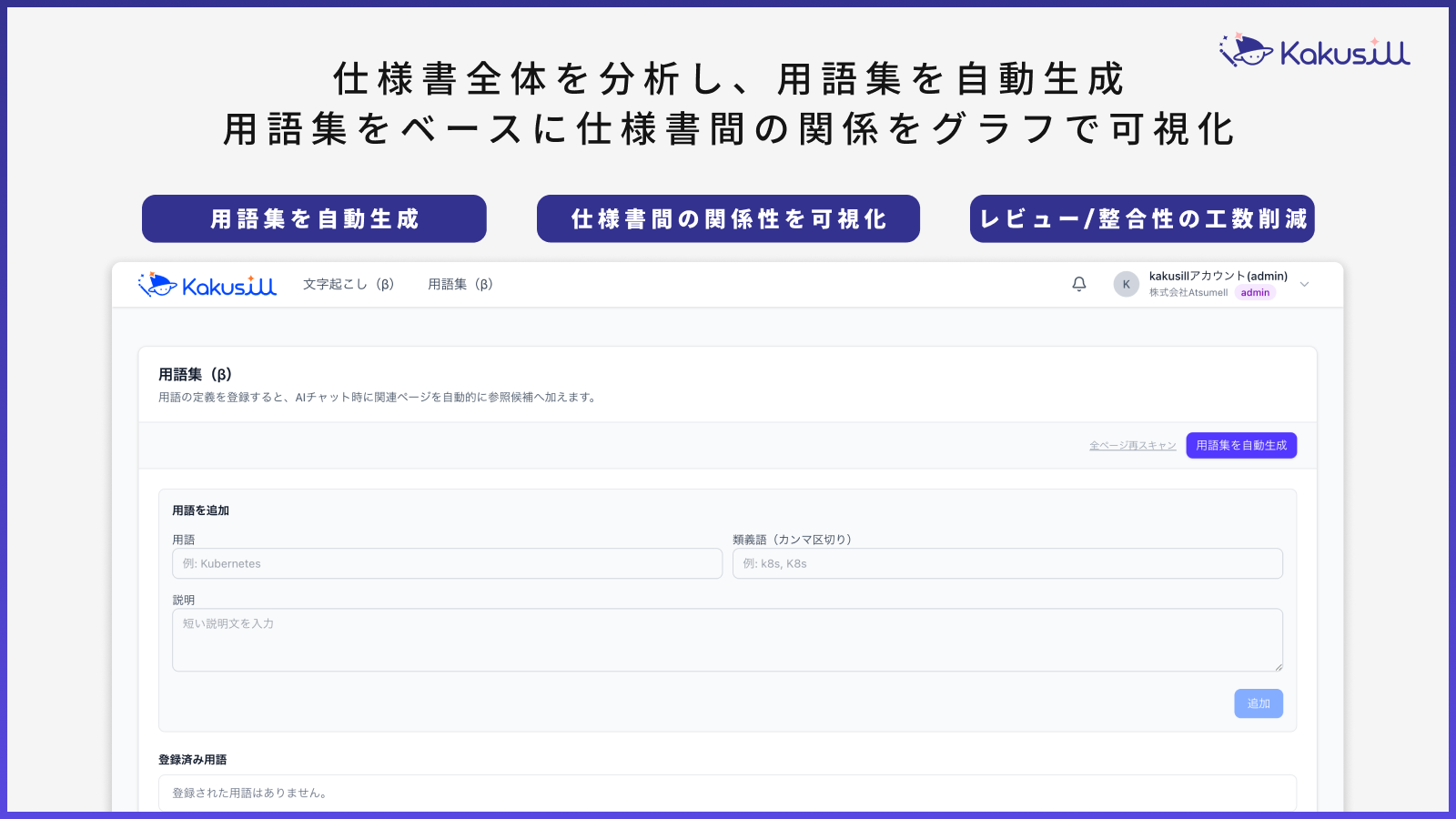 Kakusillは、プロジェクト内の仕様書全体を解析し、登場する概念・用語の用語集を自動生成します。この用語集をベースに、仕様書間の関係性をグラフとして可視化。「どの仕様書がどの仕様書と関連しているか」「同じ用語が別の文脈で使われていないか」を一目で把握できるようにします。これにより、これまで熟練PMが膨大な時間をかけて行っていたレビューと整合性確認の負荷を大幅に削減します。