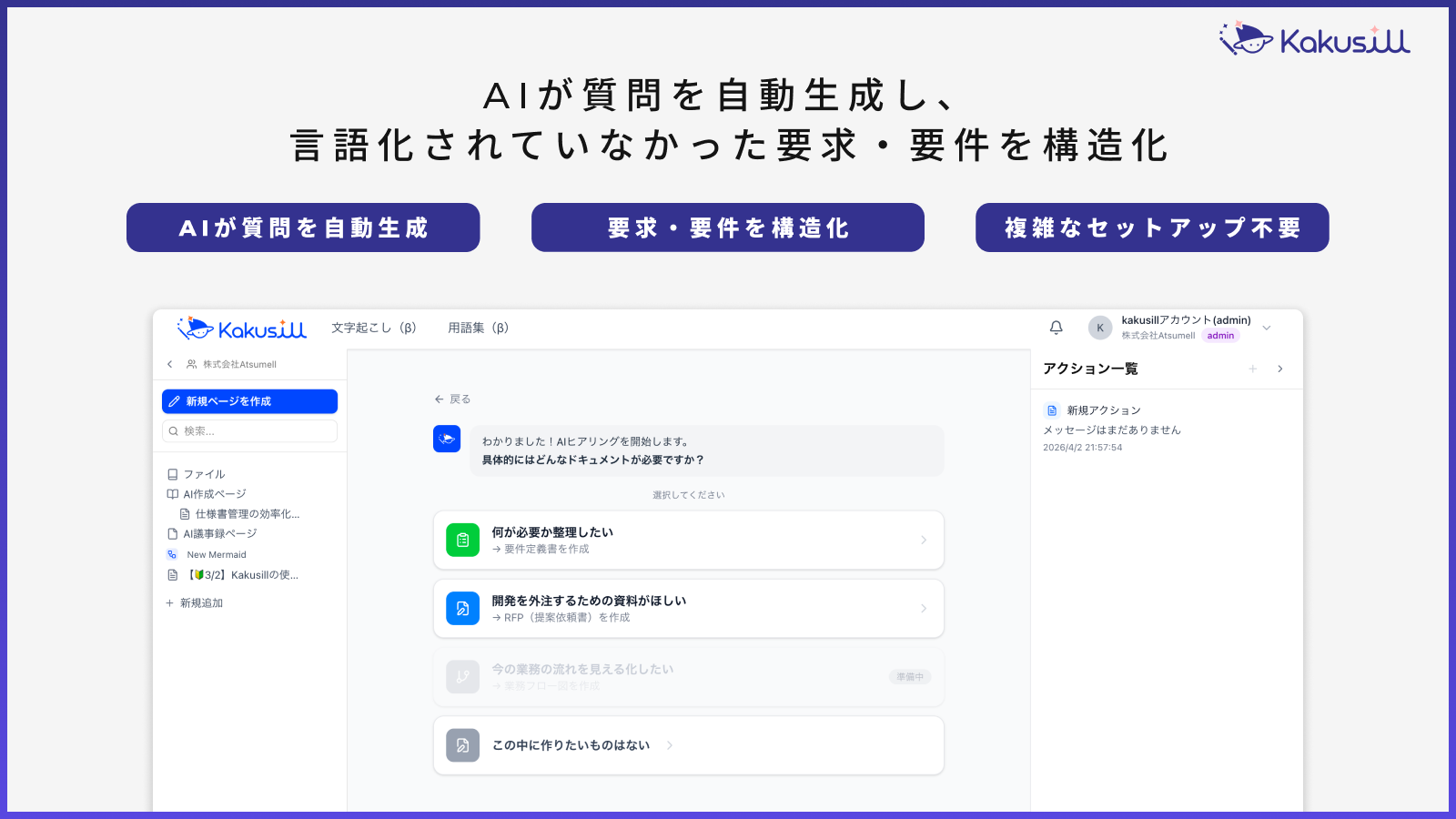 システム開発業界の構造的課題解決に取り組む株式会社Atsumell(本社:東京都中央区日本橋茅場町一丁目8番1号、代表取締役:山口公徳、以下「当社」)は、「暗黙知の抜け落ち」を解消し、AI駆動要件定義を可能にする、ガイド型AIエージェント「Kakusill(カクシル)」の提供を開始いたします。