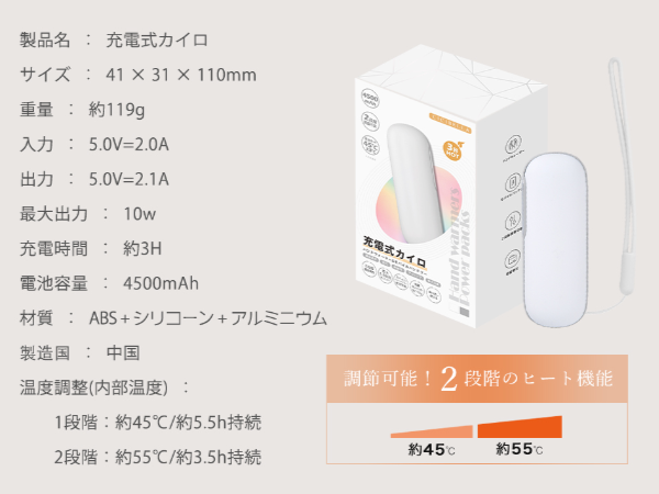 使い捨てカイロの場合、温まるまで揉んだり待ったり、すぐに温まりたい時には不便。しかし充電式カイロならそんなお悩みを解決!温度の調節は2段階(約45℃・約55℃)。屋内や屋外など、場所に合わせて快適にご使用いただけます。