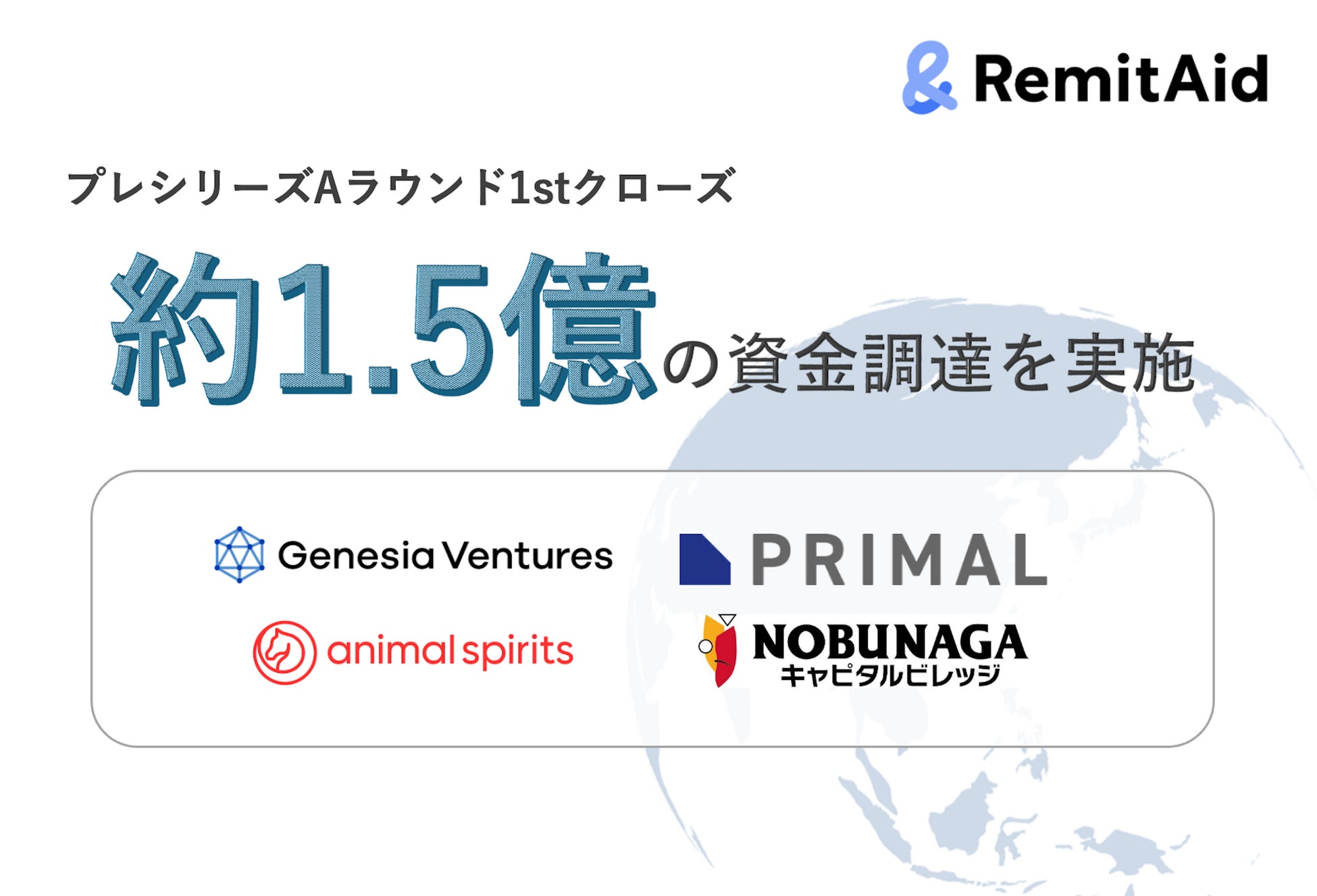 「世界に挑む日本を支える」をビジョンに掲げ、海外企業との取引を簡単にするグローバルマルチ決済プラットフォーム「RemitAid(レミットエイド)」 (https://remitaid.io/) を提供する株式会社RemitAid(本社:東京都渋谷区、代表取締役:小川裕大、以下当社)は、この度、ジェネシア・ベンチャーズをリードとし、プライマルキャピタル、アニマルスピリッツ、NOBUNAGAキャピタルビレッジ、個人投資家を引受先とした第三者割当増資およびデットファイナンスにより、プレシリーズAラウンドのファーストクローズとして総額1.5億円の資金調達を完了いたしました。