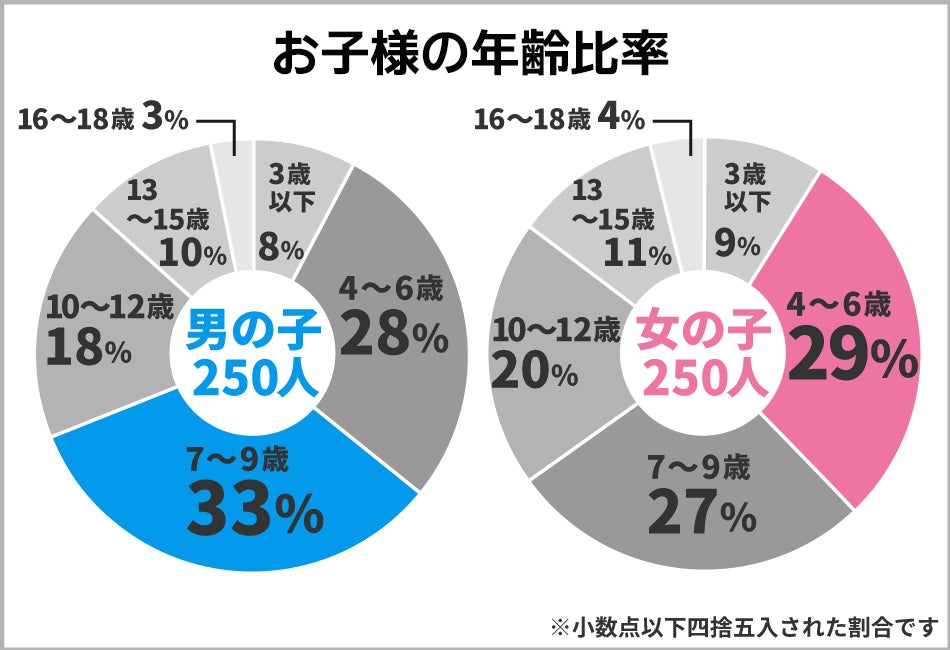 これから「人気の習い事」や「習い事にかける費用」など、「男の子のお子様の保護者」250人と「女の子のお子様の保護者」250人、合計500人のアンケート結果をご紹介していきます。