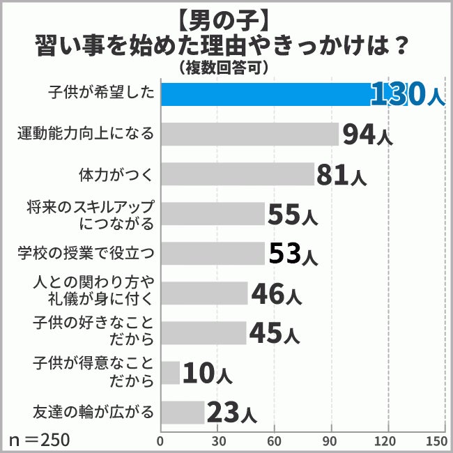第3位以降は男の子の保護者の方と女の子の保護者の方で結果は異なりますが、習い事を始めた「きっかけ」の一番の理由は「子供の意思を尊重している」結果となっています。