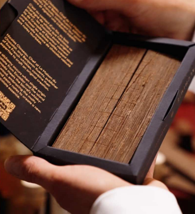 デザイン:バンジャマン・クエンツの樽と蒸留所の世界観を思わせる、薄暗さと温かみある印象のデザインに仕上げています。本商品のアートディレクター Philippe Galowich(フィリップ・ガロウィッチ)は、家具職人とその木工細工からインスピレーションを得て、縞模様を入れました。製品の中のチョコレートを包む紙は、一部リサイクル紙で、ココナッツ繊維から作られた環境に配慮した黒でマットな紙を使用しています。