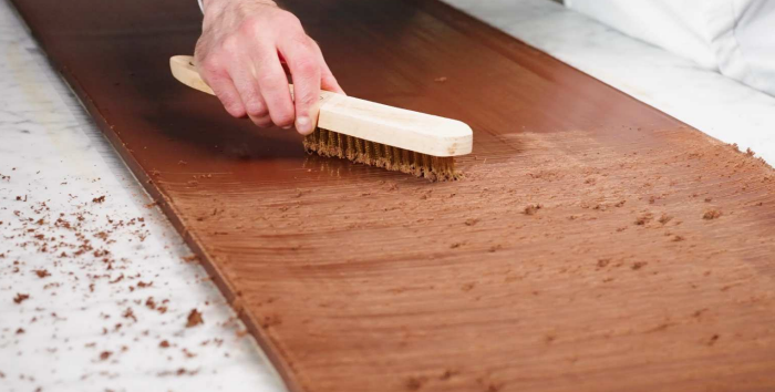 チョコレートを大理石の上に流した後に、木の質感を出すため、2つの異なるブラシを使ってブラシをかけます。