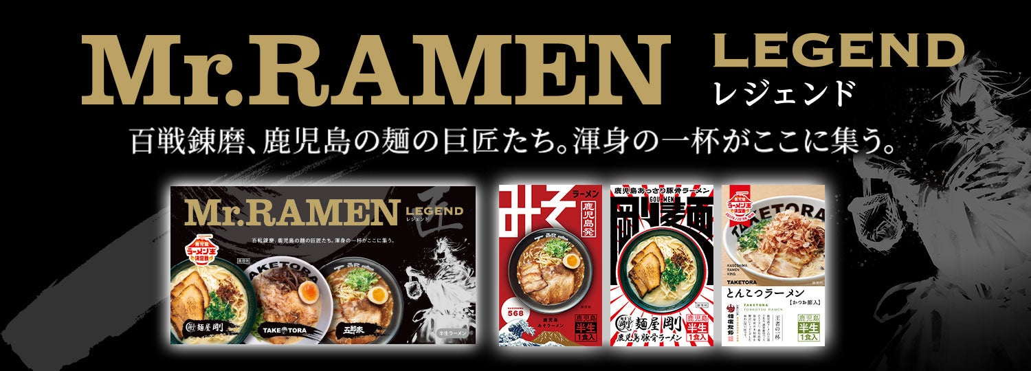 「Mr.RAMEN~レジェンド~」は鹿児島ラーメン王決定戦から歴代常勝店の個性あふれる美味しさを集結させました。麺屋 剛、TAKETORA、五郎家の3店舗の詰合せです。