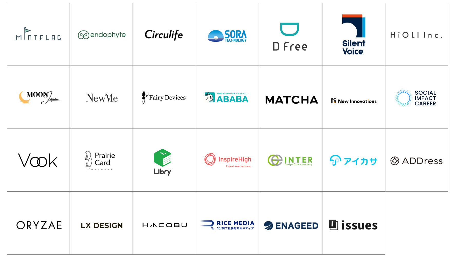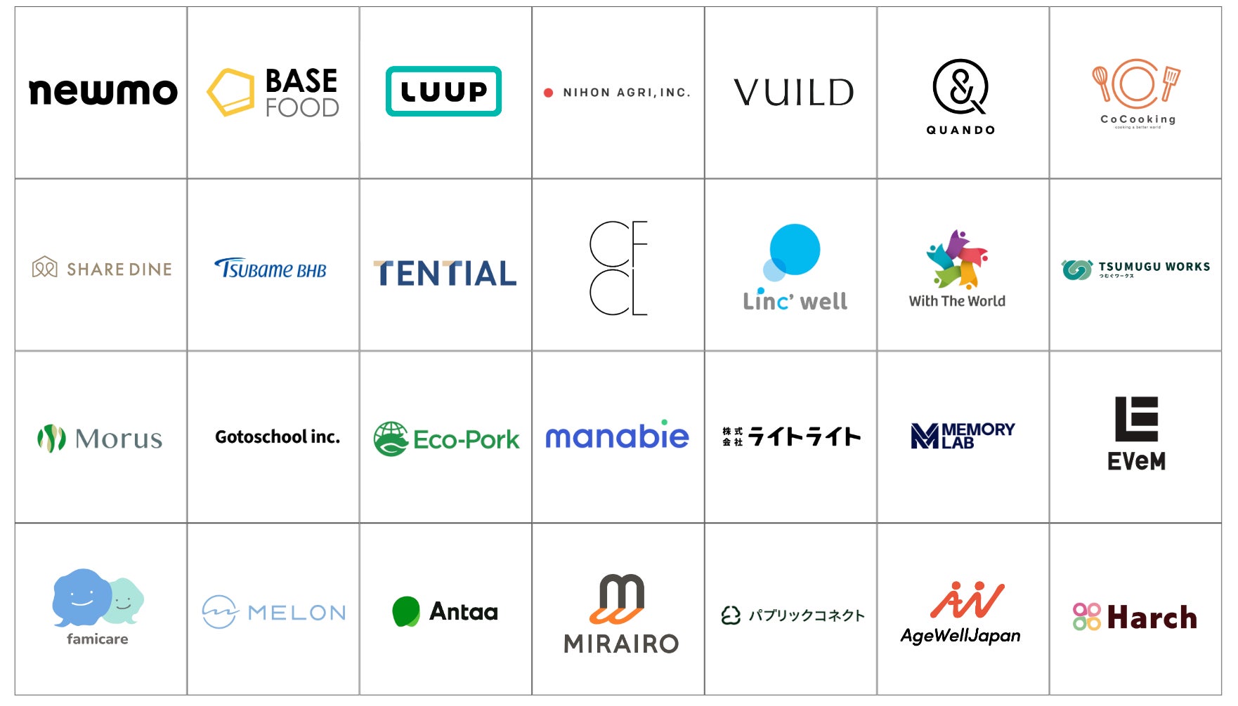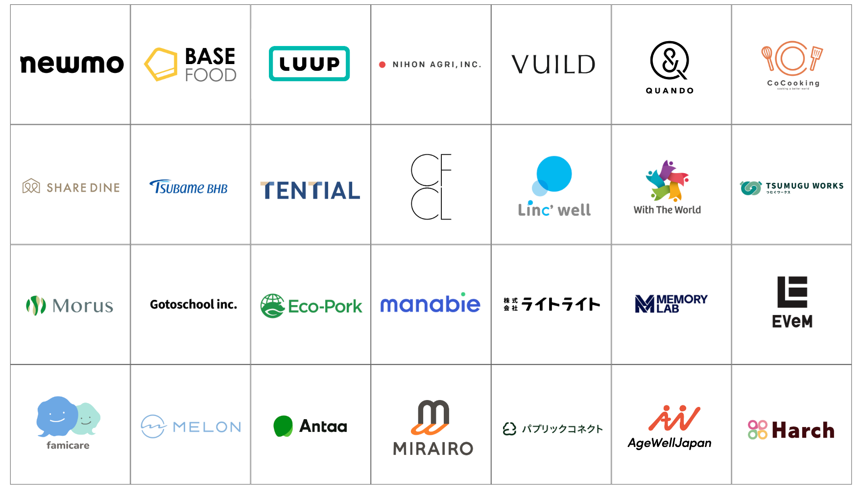 newmo株式会社、ベースフード株式会社、株式会社Luup、株式会社日本農業、VUILD株式会社、株式会社クアンド、株式会社コークッキング、株式会社シェアダイン、つばめBHB株式会社、株式会社TENTIAL、株式会社CFCL、株式会社Linc'well、株式会社With The World、TSUMUGU WORKS株式会社、Morus株式会社、株式会社Gotoschool、株式会社Eco-Pork | Eco-Pork co., ltd.、Manabie International Private Limited、株式会社ライトライト、株式会社MEMORY LAB、株式会社EVeM、株式会社NEWSTA、株式会社Melon、アンター株式会社、株式会社ミライロ、株式会社パブリックコネクト、株式会社AgeWellJapan、ハーチ株式会社、ミントフラッグ株式会社、株式会社エンドファイト、株式会社Circulife、SORA Technology株式会社、DFree株式会社、株式会社Silent Voice、株式会社HiOLI、株式会社MoonJapan、NewMe株式会社、Fairy Devices株式会社、株式会社ABABA、株式会社MATCHA、株式会社New Innovations、株式会社Sync、株式会社Vook、株式会社スタジオプレーリー、株式会社Libry、株式会社Inspire High、株式会社インターホールディングス、株式会社 Nature Innovation Group、株式会社アドレス、株式会社オリゼ、株式会社LX DESIGN、株式会社Hacobu、Tomoshi Bito株式会社、株式会社エナジード、株式会社issues