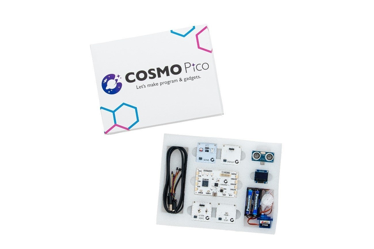内容:COSMO-Pico、COSMO-Editor(アドバンスプラン 1ヵ月分)、拡張ボード×4、ディスプレイ、サーボモーター、超音波センサー、湿温度センサー、ケーブル類、電池ボックス。