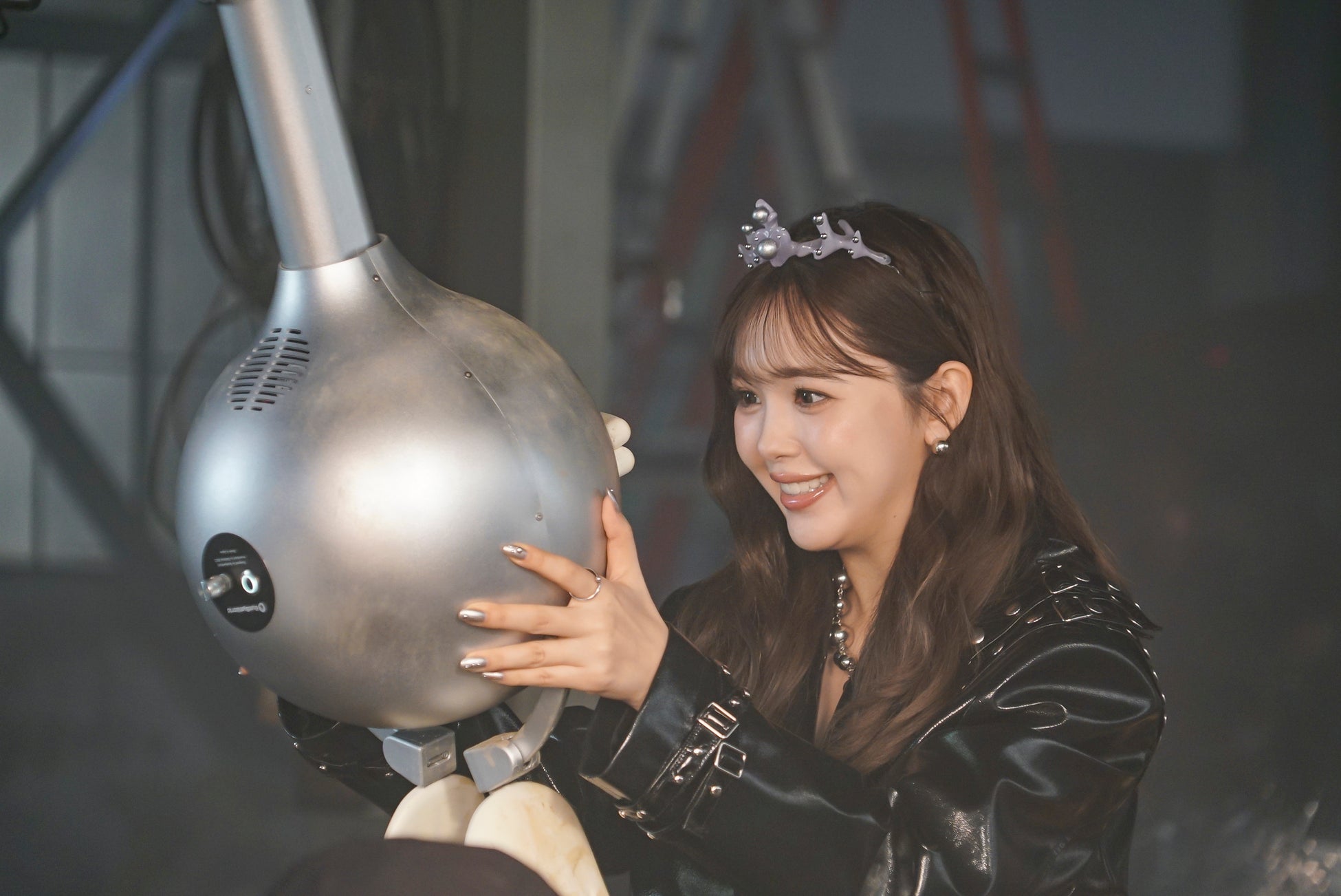 銀玉の装飾を施したアクセサリーやエナメルのコートをまとい「PACHI-PACHI-QUEEN」らしい妖艶な雰囲気を漂わせながら撮影現場に登場した藤田ニコルさんは、工場跡地を利用した大規模な美術セットに興味津々。天井から吊るされたビッグクラッピーをみつけ「可愛いけど、かわいそう…」と優しくみつめるひと幕も。しかし突然、ビッグクラッピーが言葉を発するアクシデントが発生。「びっくりした~(笑)」と笑顔で驚く藤田さんの様子に、現場の空気がほっこりと和みました。