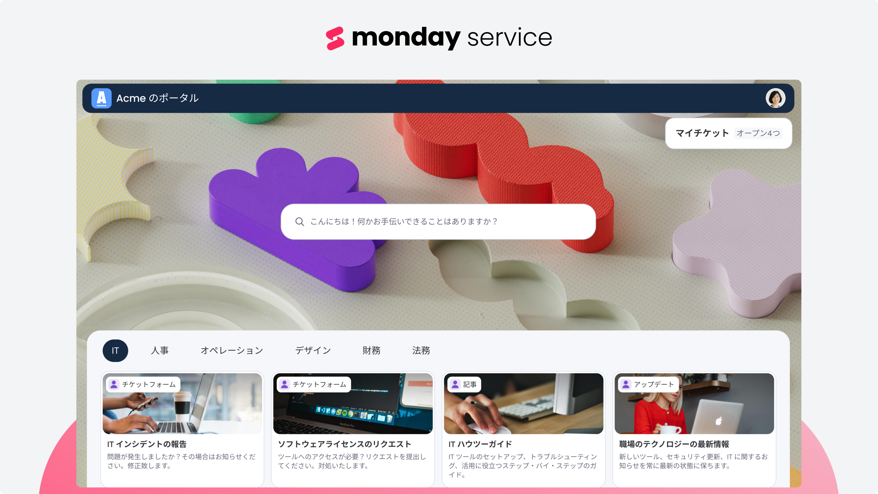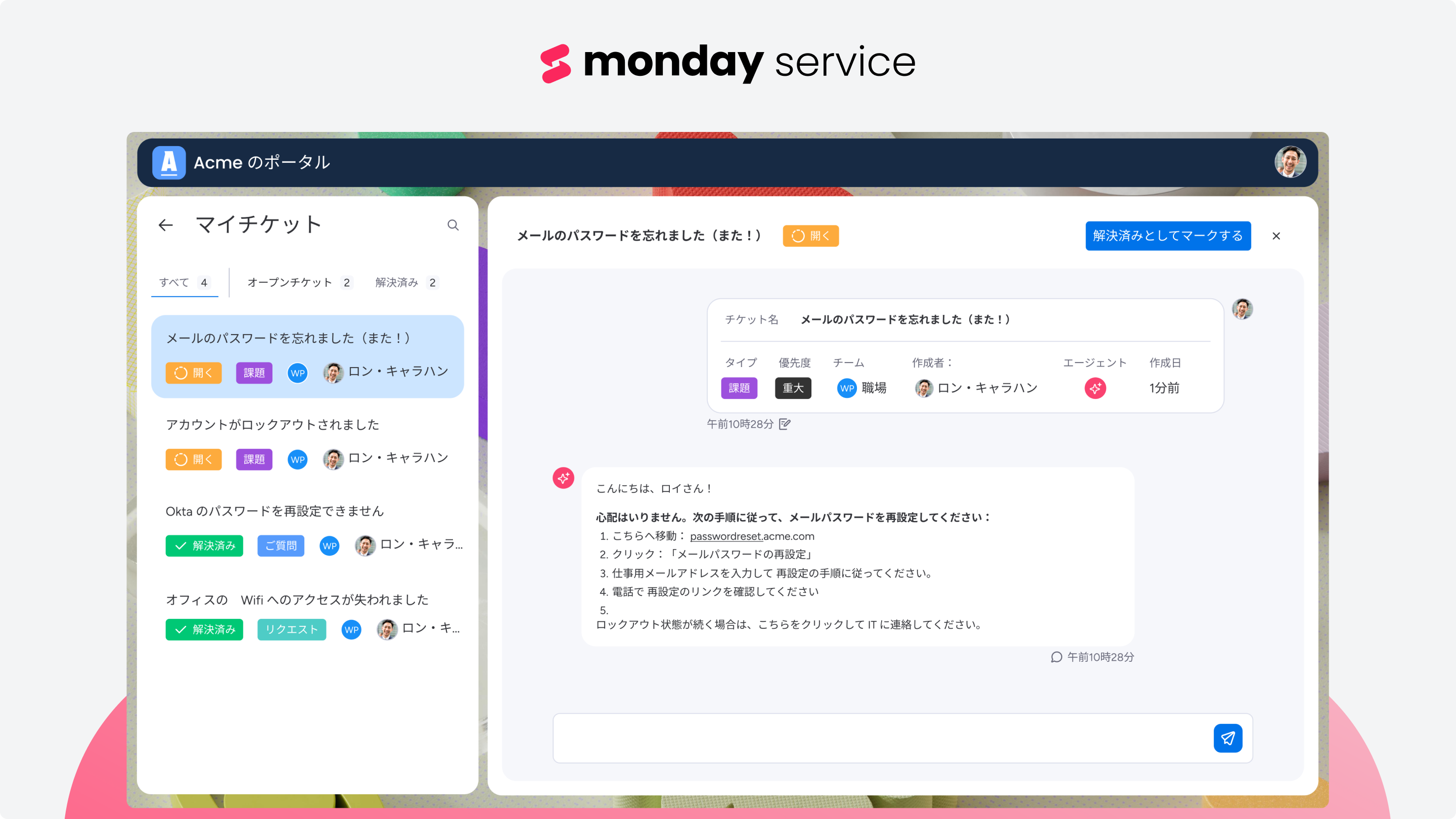 東京 2025年5月28日 – monday.com Ltd. (NASDAQ: MNDY) (以下「monday.com 」) は、monday service をベータ版から正式リリースし、すべてのお客様にご利用いただけることを発表しました。monday service は、AIを活用したエンタープライズサービスマネジメント (ESM) プラットフォームとして組織全体のサービス業務を革新し、スピーディーで高品質なサポートを実現します。