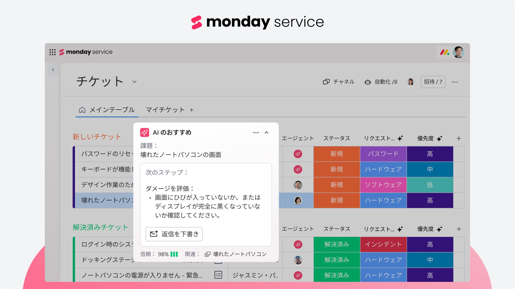 AIを駆使したスマートな自動化で、monday service は IT、ビジネス、サービスチームのオペレーションを統合。ワークフローを効率化し、エージェントが重要な課題に専念できる環境を提供します。monday service は、すべてのリクエスト、インシデント、プロジェクト、ビジネスデータを一元管理し、円滑なコラボレーションを促進してリソースを増やすことなく業務効率を高め、迅速な解決を実現するほか、外部のお客様やベンダーと連携し、部門間のワークフローをスムーズに接続します。monday.com の 4つ目の製品である monday service はすでに多くのお客様に支持され、年間契約価値 (ACV) で最も高い製品へと進化しています。