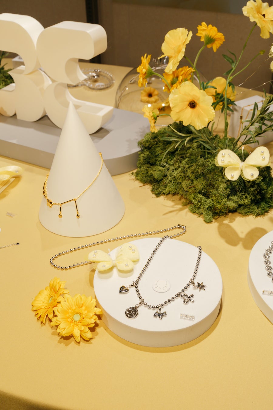 今回のpop up shopでは、ハッピーなイエローをキーカラーに「春のうれしい気持ち」をテーマにした空間を制作。ブランド初のちょうちょモチーフのコレクション「Feel good collection」が初めて店頭に並びます。そのほかにもシンプルになりがちな初夏から夏にかけての装いのアクセントになるアイコニックなアイテムの数々が登場します。