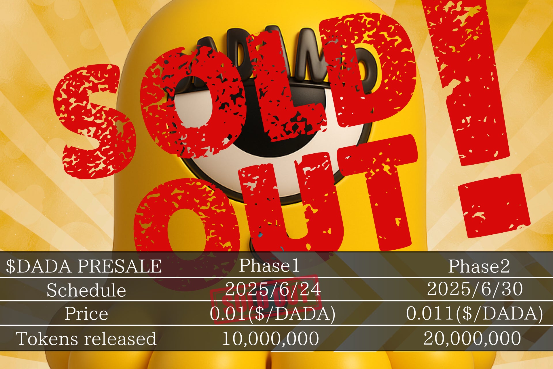 Web3メディアプラットフォーム「DADAMO(ダダモ)」(運営:ALEALAM INVESTMENTS/本社:UAE Dubai)の基軸通貨である$DADAトークンが、2025年6月24日00時00分(日本時間)に実施された初回プレセールにて10,000,000 DADA(約10万ドル相当)を即完売。累計販売数は早くも9,000万枚を突破し、今後のフェーズに向けて国内外からの注目と期待が急速に高まっています。