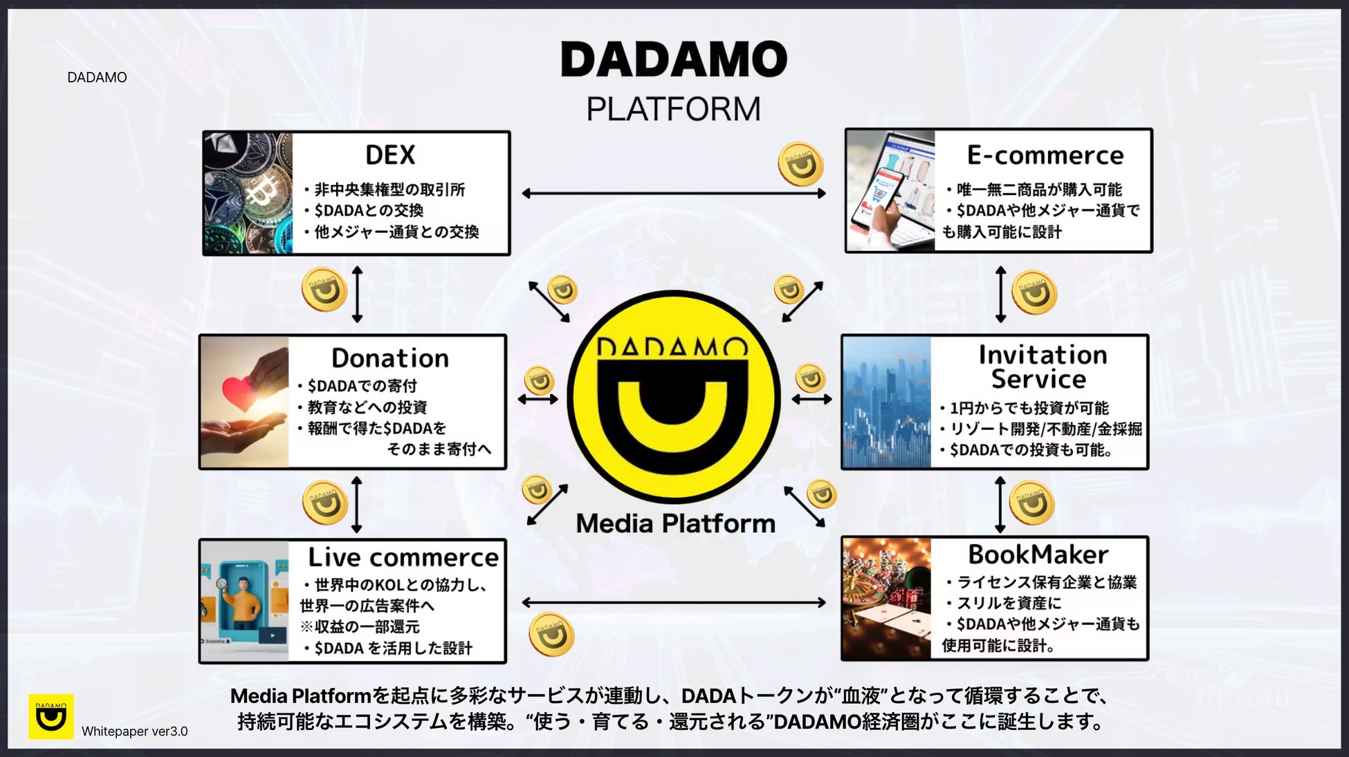 DADAMOは、アニメ・映画・スポーツ・アイドル・伝統文化・グッズ・不動産・教育・貿易・寄付体験など、世の中のあらゆる分野を「誰もが参加できるエンタメ」へと再定義。その多様な体験価値をDADAトークンと結びつけ、楽しみながら資産形成も可能にするWeb3統合型プラットフォームです。世界中の誰もが、“好き”を通じて価値を持ち合える経済圏づくりに、今後もDADAMOは挑戦してまいります。