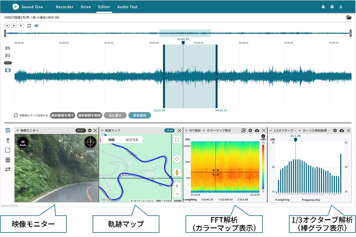 Webアプリ Sound Oneでは、走行ルートを示す『軌跡マップ』に加えて、映像・速度・加速度を一画面で同期表示できるようにいたしました。レイアウトは最大4ウィンドウまで自由に配置でき、映像モニター、軌跡マップ、周波数解析(FFT/オクターブ/音質評価)などを並べて“同時に”観察することで、NVH評価にお使いいただけます。時間カーソルは各ウィンドウで常に同期し、事象の前後関係を丁寧に追えるため、原因の切り分けや再現試験の条件出しが効率化します。