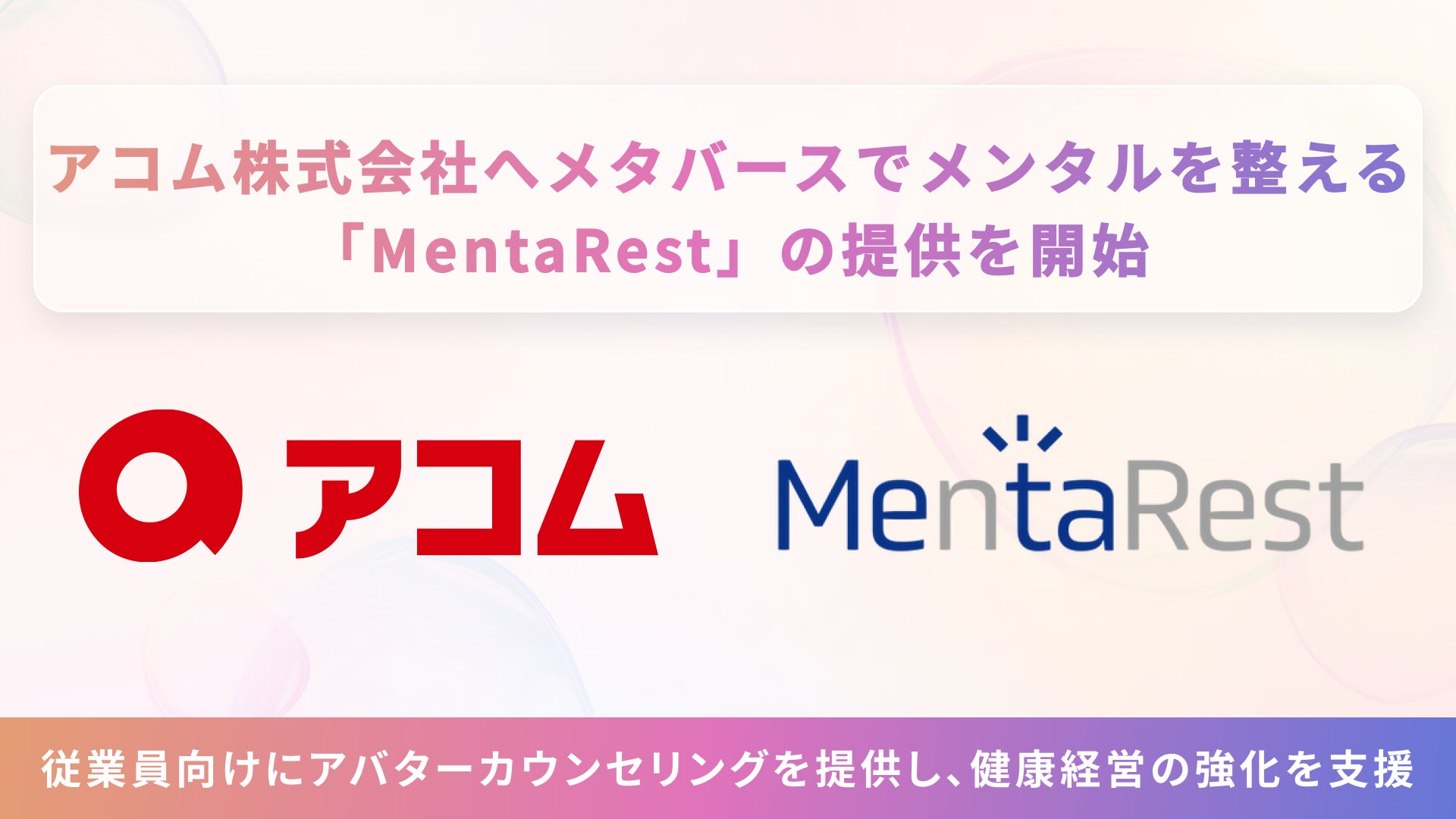 株式会社MentaRest(本社:東京都 渋谷区、代表取締役:飯野 航平、以下「当社」) は、メタバースでメンタルを整える『MentaRest』(メンタレスト)を、アコム株式会社(本社:東京都 港区、代表取締役:木下政孝、以下「アコム社」)に提供開始したことをお知らせいたします。