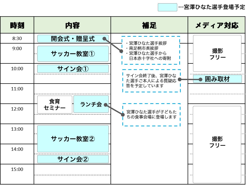 ◆内容 宮澤ひなたサッカー教室(第一部:小学生男女約40人、第二部:県西地区中学校女子選抜20人)、食育セミナー、サイン会など