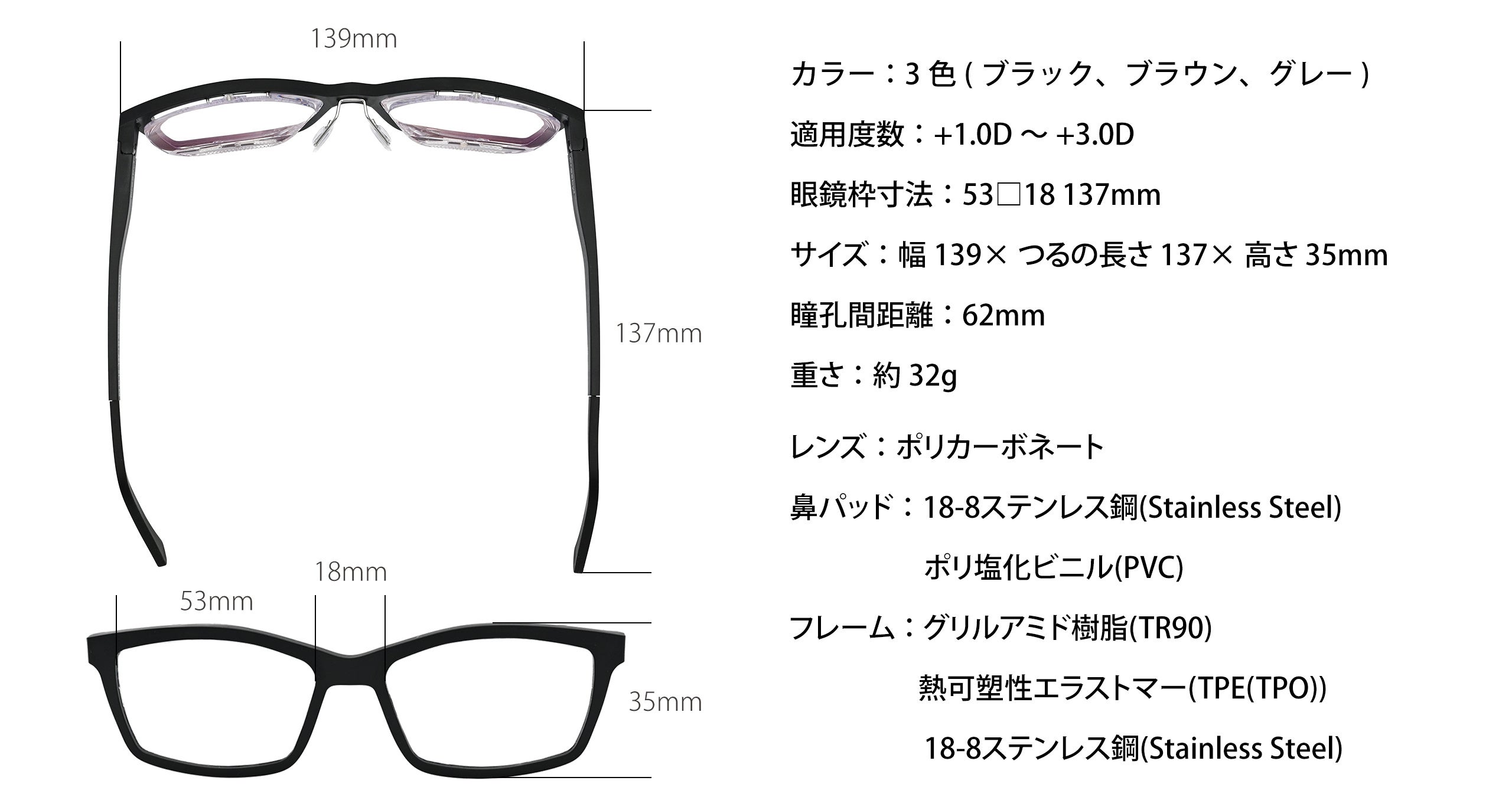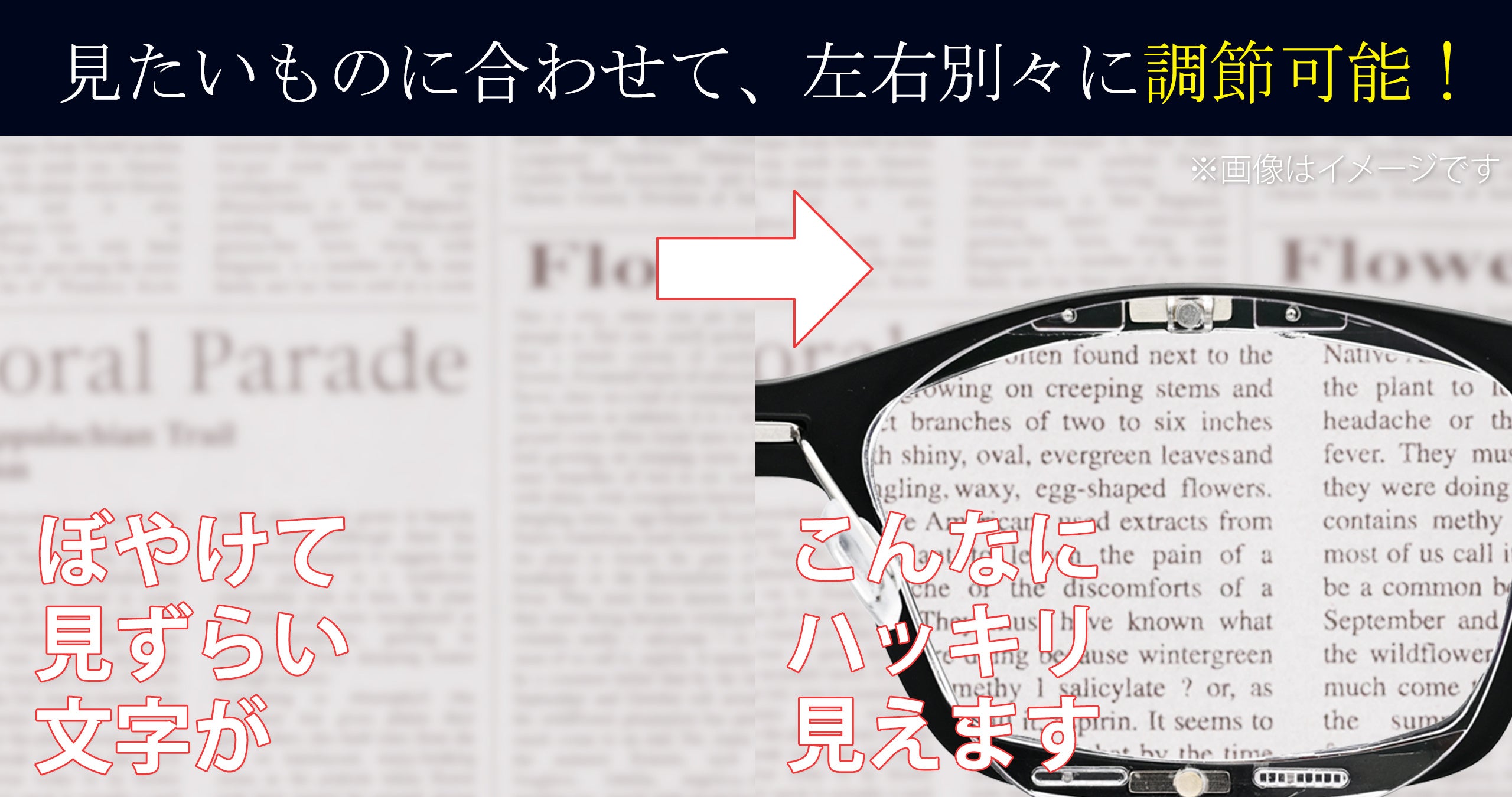 その日の視力や見たいものの距離に合わせて、2枚重なったレンズの目元に近い側のレンズを横にスライドするだけで度数が+1.0D〜+3.0Dの5段階で調節できます。