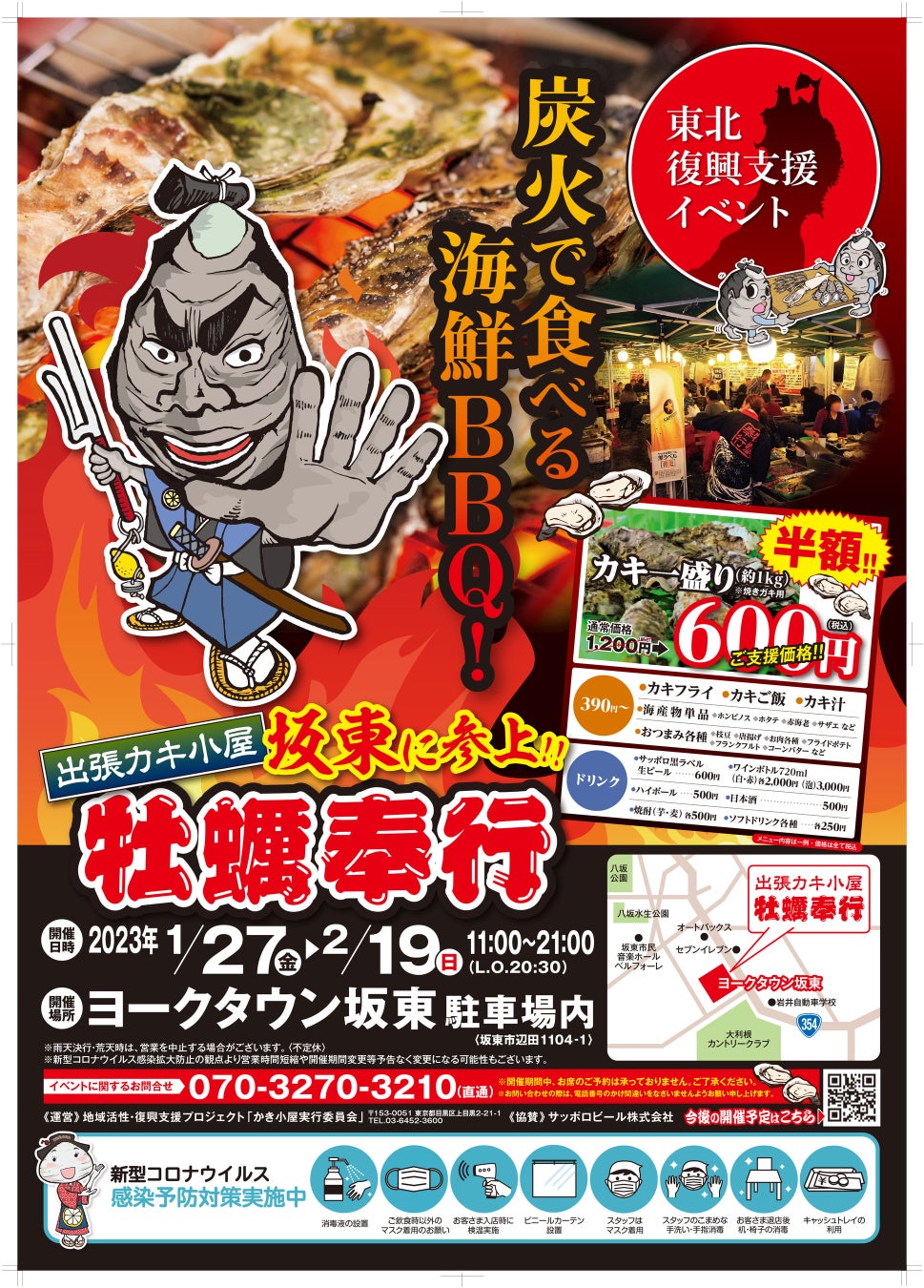 宮城県石巻の牡蠣をセルフ炭火焼き(海鮮BBQ)で楽しむ「出張カキ小屋 牡蠣(かき)奉行」(TEL 070-3270-3210)がヨークタウン坂東(茨城県坂東市)に期間限定オープン。期間は1月27日〜2月19日
