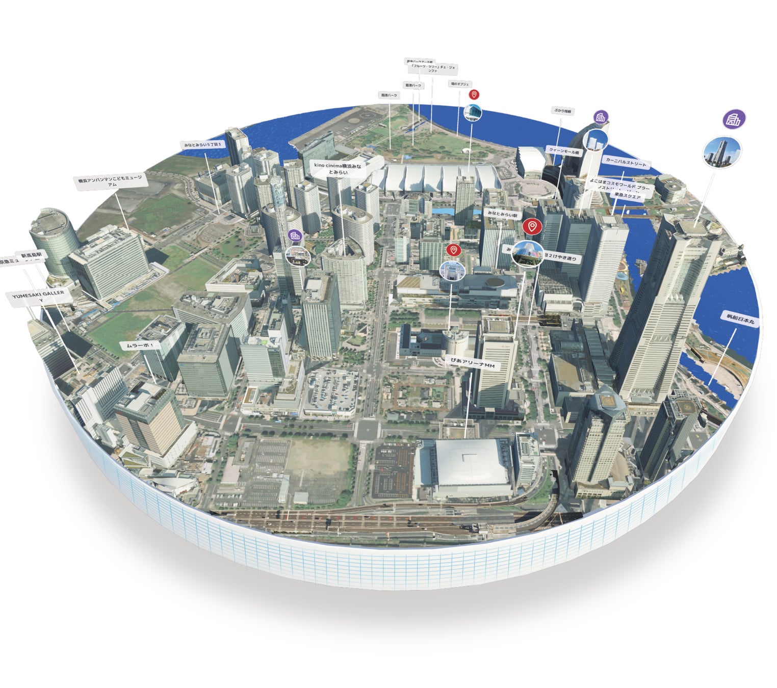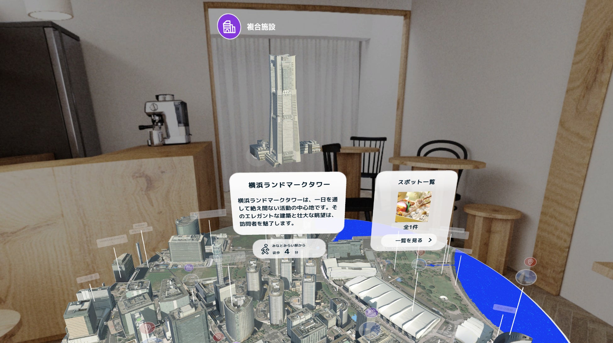 ジオラマ上にあるスポットピンから、ユーザーは様々な施設を探索できます。 ピンを選択すると、施設の詳細情報が表示され、ユーザーにその特徴をわかりやすく案内します。