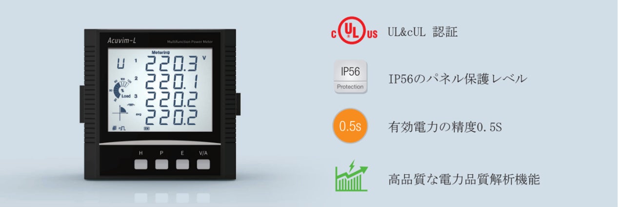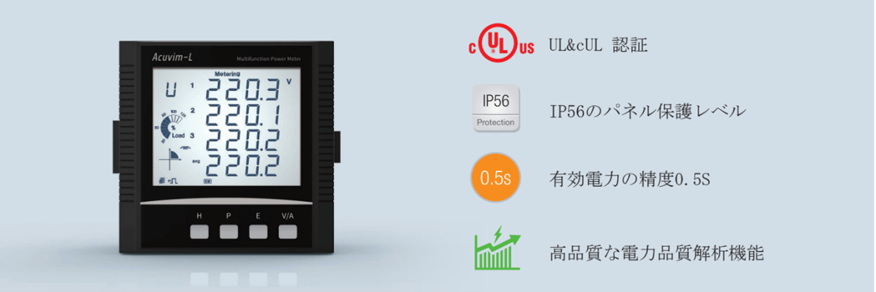 Acuvim-Lシリーズは、高い測定精度を持つ電力計測器です。このシリーズは、0.2%の高精度クラスであり、高品質の部品を使用しているため、信頼性が高く長期的な安定性が保証されています。特に、国内市場では電力計測の精度に対する要求が高く、Acuvim-Lシリーズの高い測定精度は大きなメリットとなります。また、ULおよびIEC認証を取得しているため、欧米市場においても高い評価を受けています。