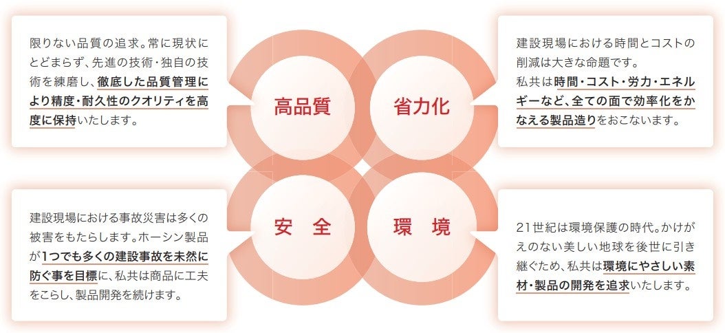 株式会社ホーシンは、1982年創業。「共生(ともいき)」という精神、すなわち「お客様につくす心が自らを成長させる力となり、お客様と共に発展していく力になる」という確固たる経営理念のもと、ものづくりの4つのこだわりを元に、企画から設計・製造・販売・レンタル・メンテナンスまで一貫体制で取り組む、建設資材のパイオニアとして、お客様に製品とサービスを提供します。