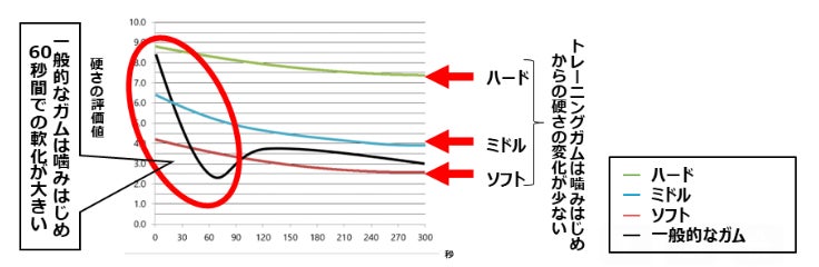 80回/1分間のペースで計5分間ガム咀嚼し、6秒ごとに硬さを評価するTI法*2で評価を行った。