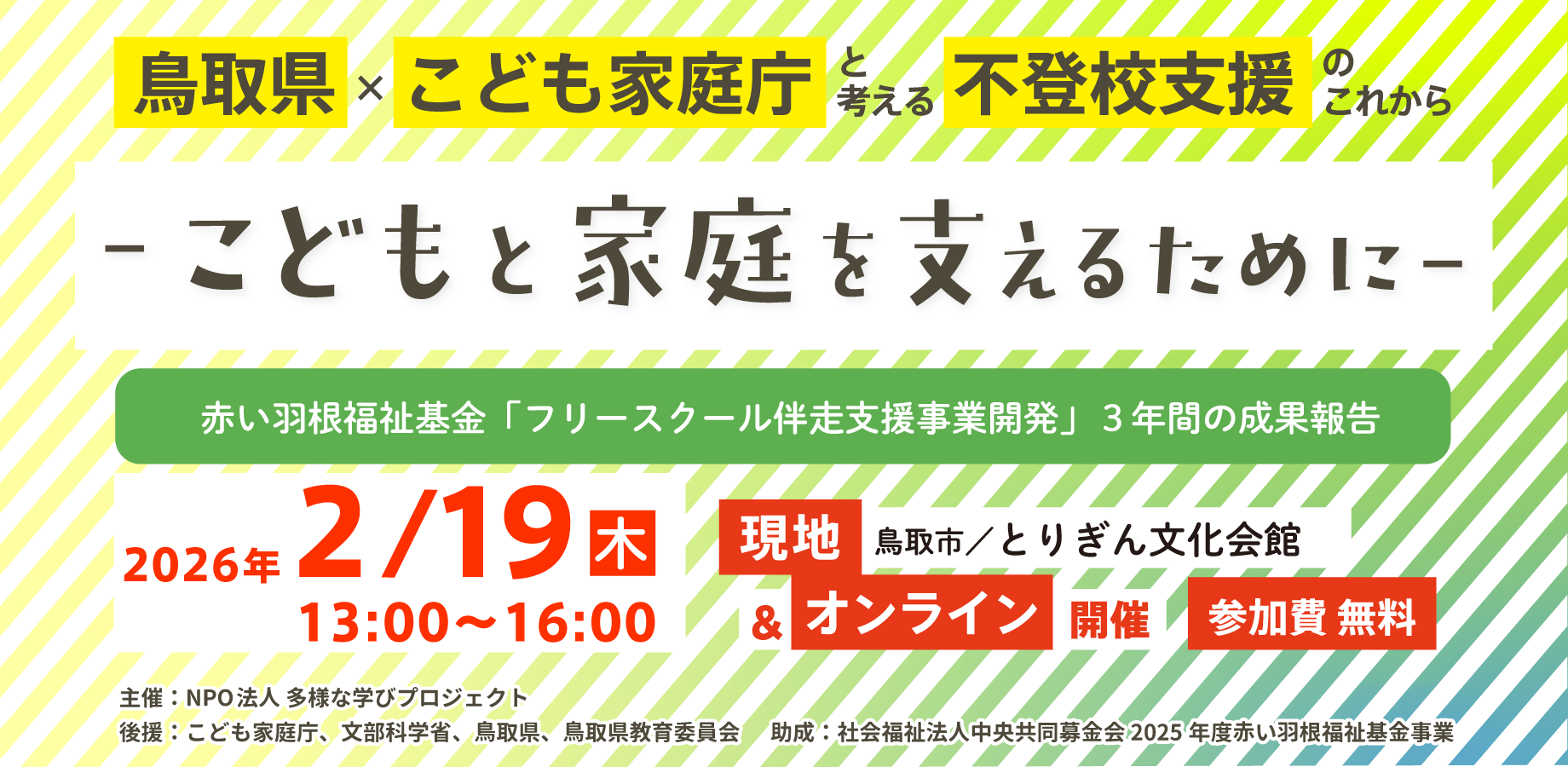 特定非営利活動法人 多様な学びプロジェクト(代表理事:生駒知里、以下、「多様な学びプロジェクト」)は、2026年2月19日(木)、シンポジウム「鳥取県×こども家庭庁と考える 不登校支援のこれから~こどもと家庭を支えるために~ 赤い羽根福祉基金「フリースクール伴走支援事業開発」3年間の成果報告」と題し、鳥取県(オンライン同時配信)にて開催します。