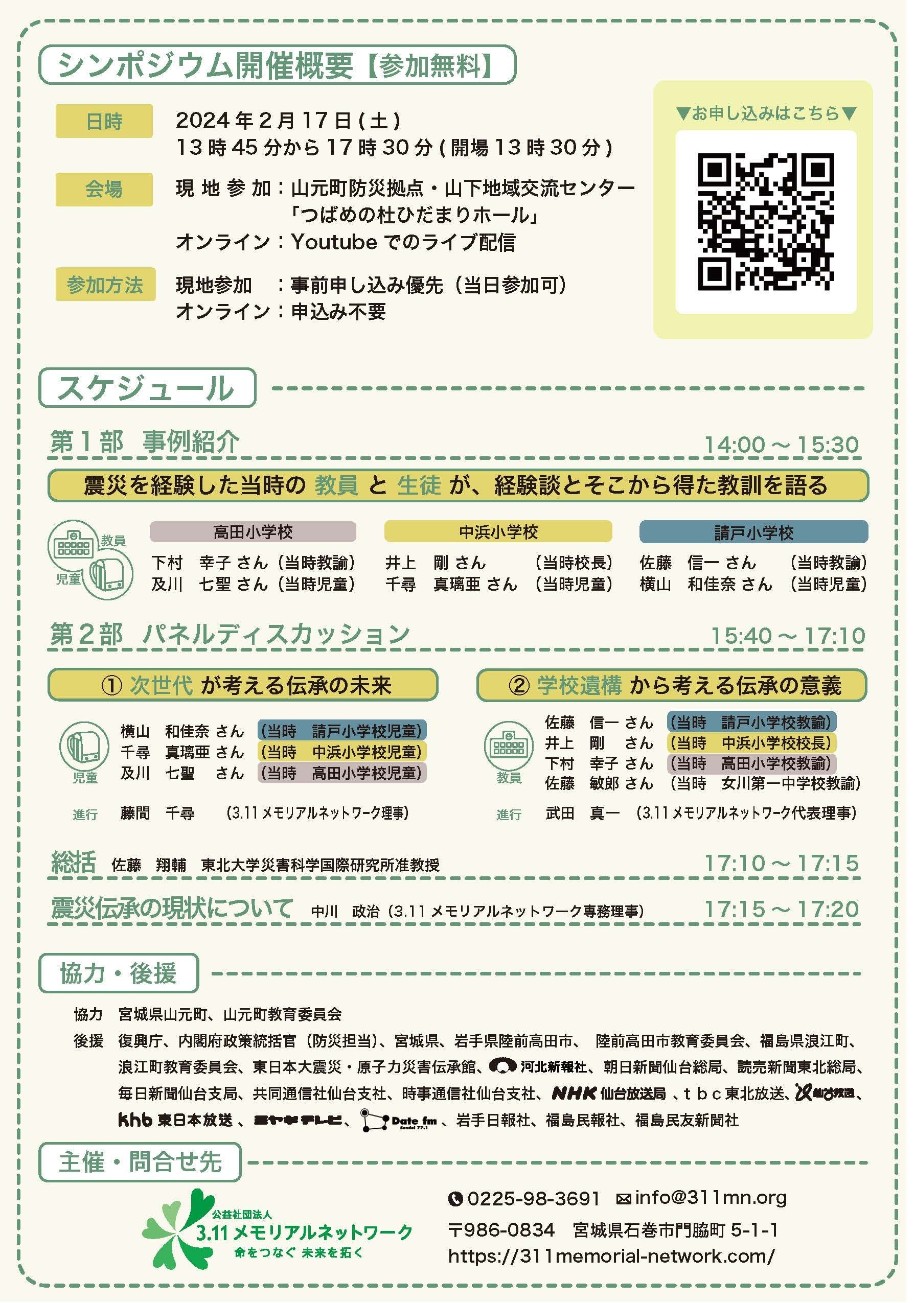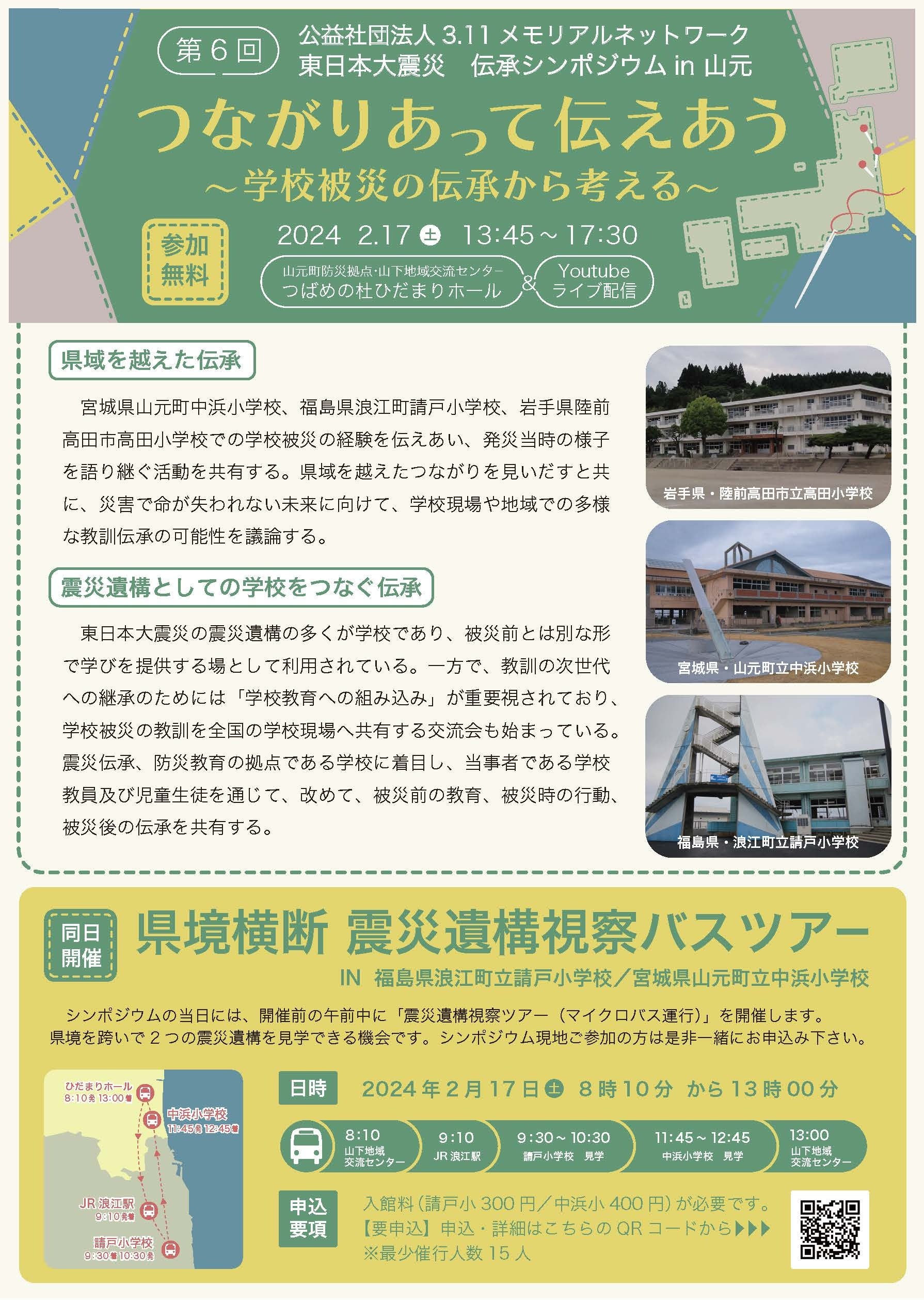 公益社団法人3.11メモリアルネットワーク(所在地:宮城県石巻市、代表理事:武田真一)は、「第6回東日本大震災伝承シンポジウムin山元 つながりあって伝えあう~学校被災の伝承から考える~」の参加者を募集しています。(現地参加およびオンライン視聴可能)