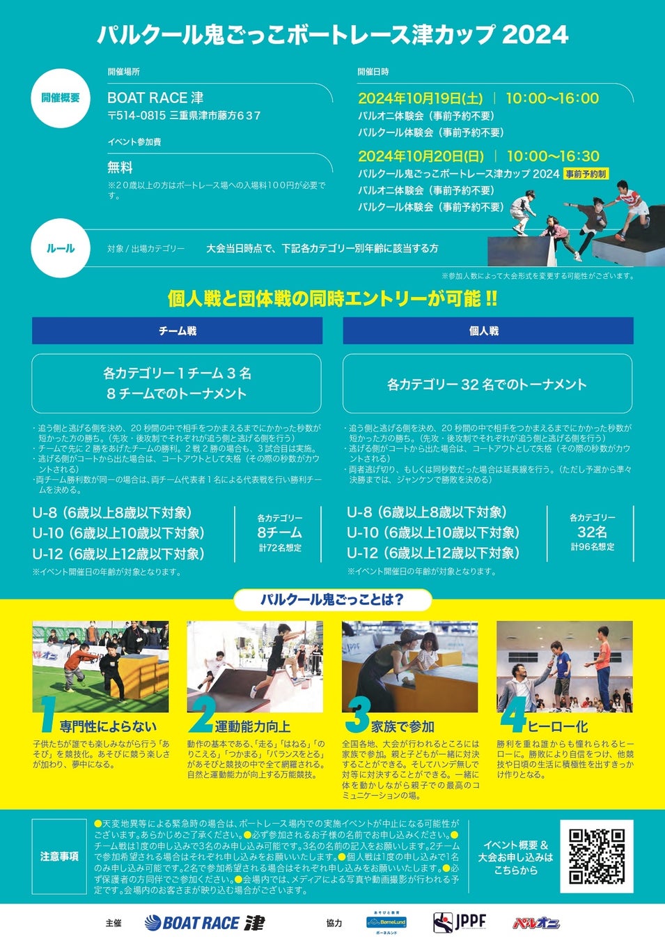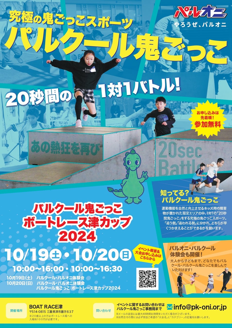 2024年10月19日(土) 10:00〜16:00 パルクール鬼ごっこボートレース津カップ2024(事前予約制) パルオニ体験会(事前予約不要) パルクール体験会(事前予約不要) |